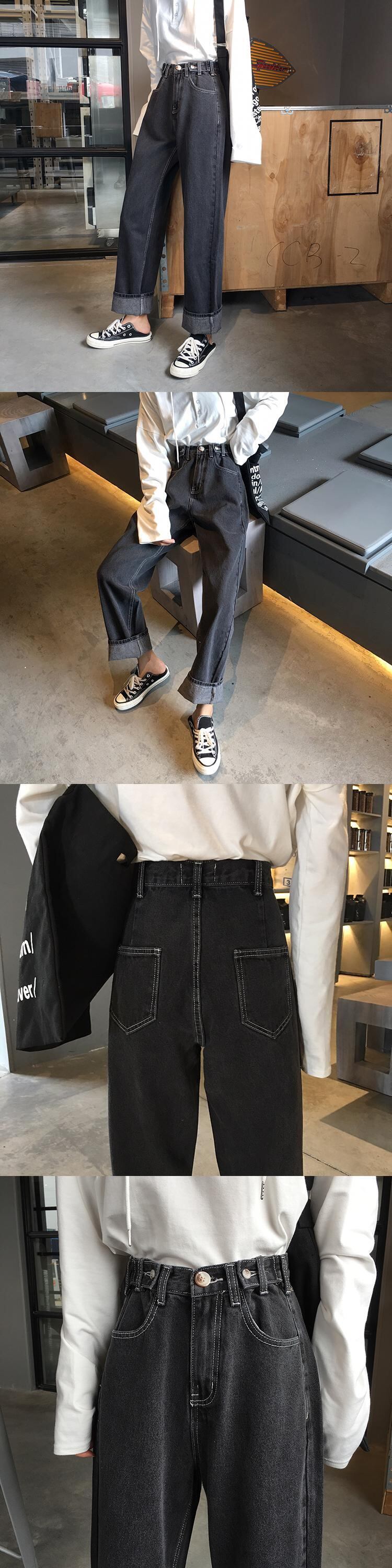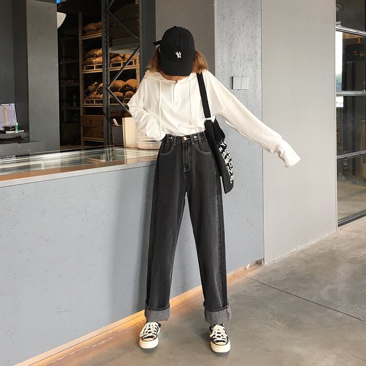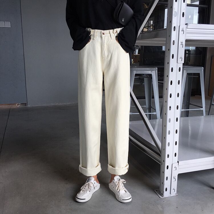 春と夏のレトロ緩い調節可能なボタンジーンズハイウエストワイドレッグパンツストレートパンツズボン学生パンツ女性 misskkl46181790499