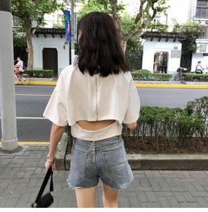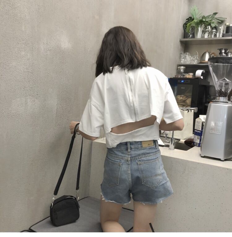 ソリッドカラーの夏の婦人服の新しいバージョンのオープンバックショートTシャツ緩い人格ジッパー半袖薄いトップ学生 misskkl43266696653