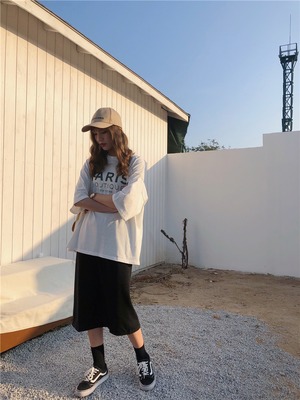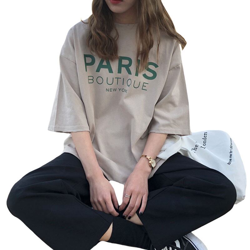 2019新しい秋の服の女性の緩い半袖ラウンドネックレタープリントTシャツミドル丈トップボトムシャツ misskkl42520024672