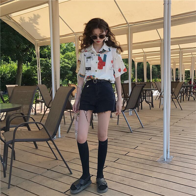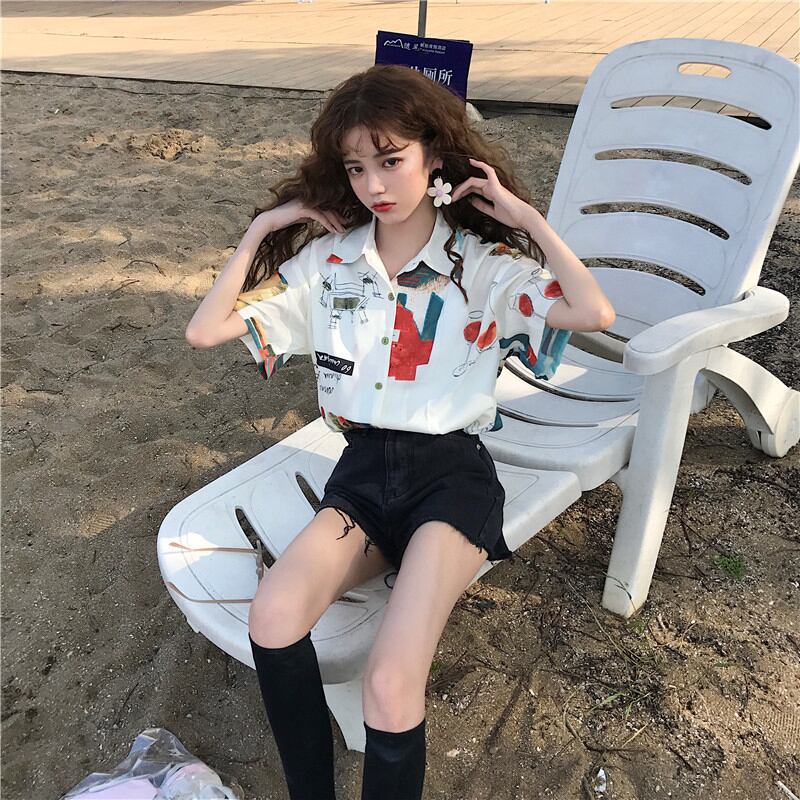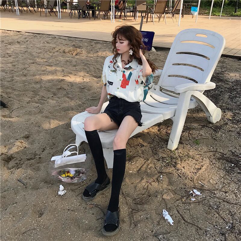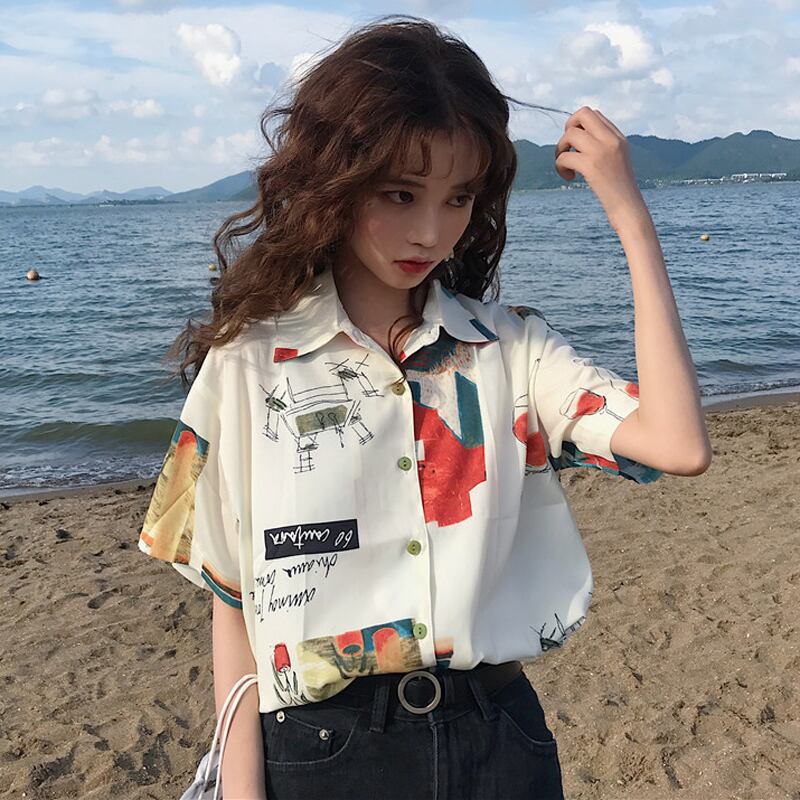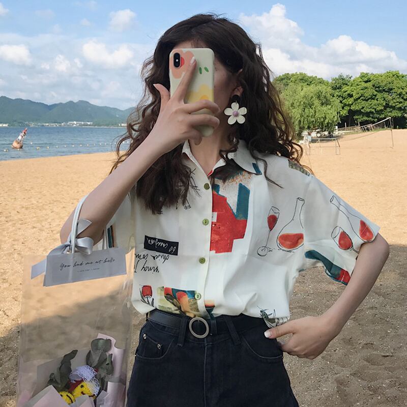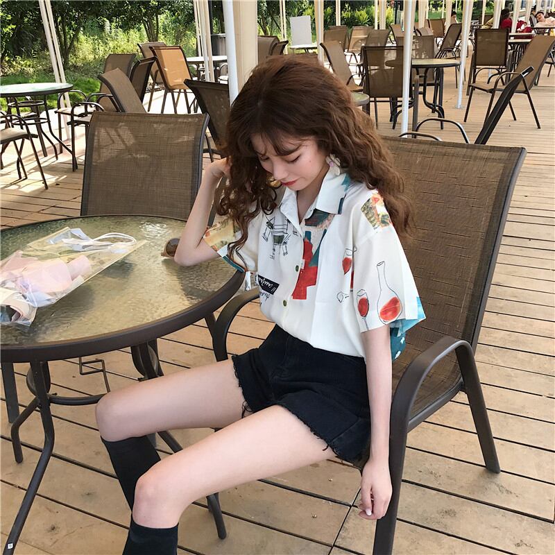 2020年夏の新しいレトロな香港スタイルのポロシャツのデザインセンスプリントトップルーズ半袖ニッチシャツ女性の薄い misskkl55973087466