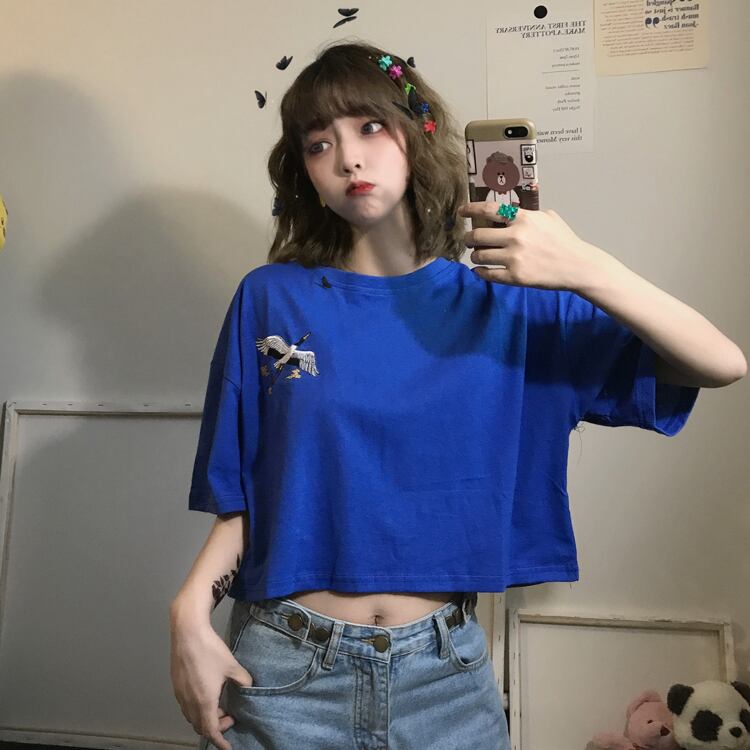夏バージョン2020新しいinsクレーン刺繍緩い少しセクシーなへそ短学生半袖Tシャツ女性の潮 misskkl22583893345