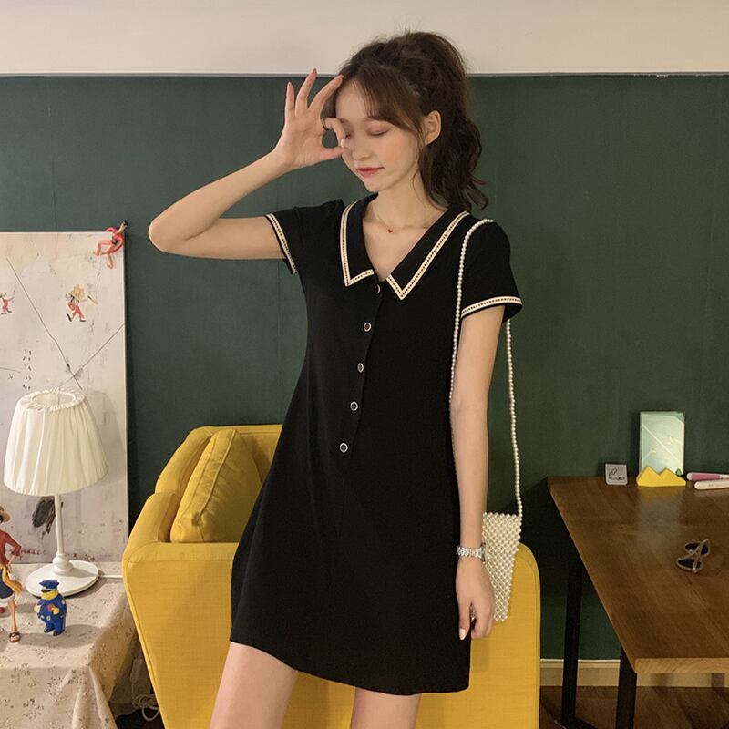 2019新しいシックな小さな黒いドレス気質aラインショートスカートウエストは薄い学生の半袖ドレス女性の夏 misskkl71700309133