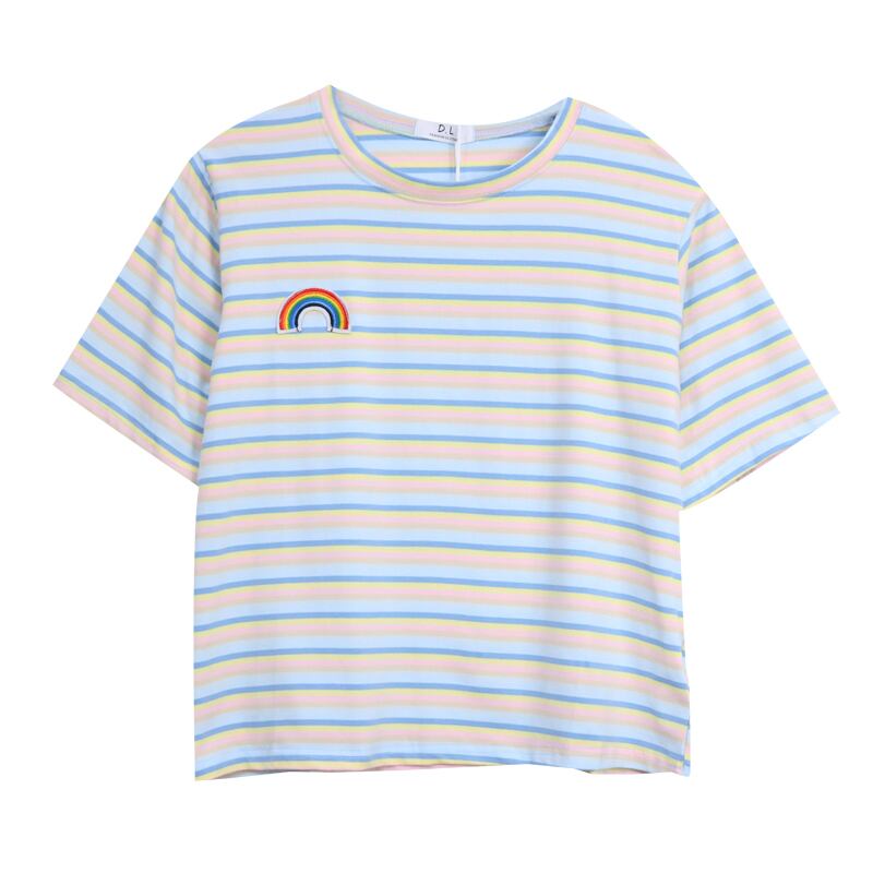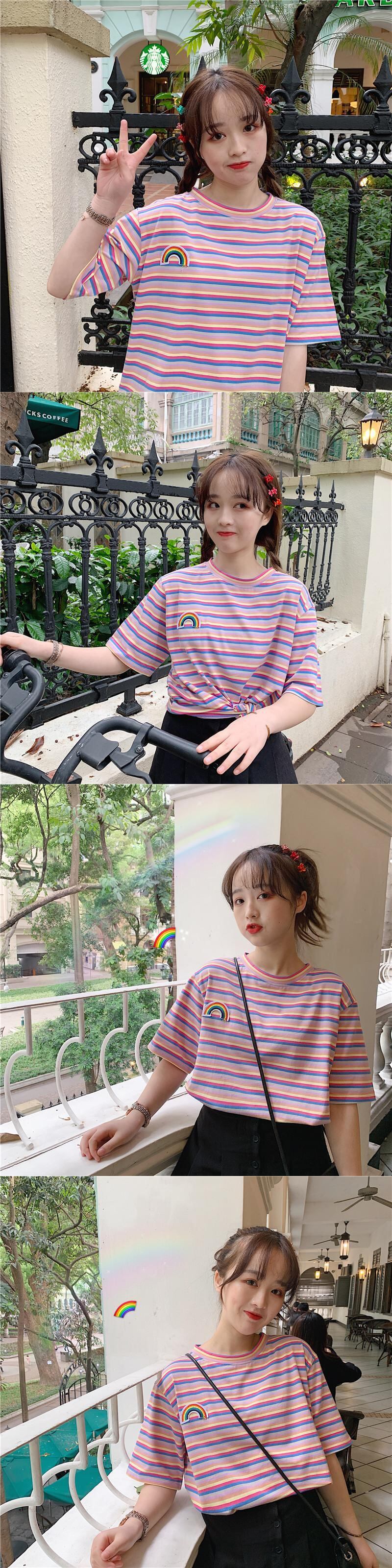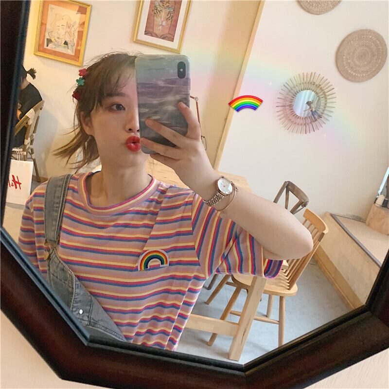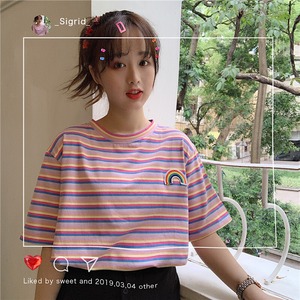 夏の学生のレインボーストライプの半袖Tシャツの女性のネット赤ins香港スタイルのトップ緩い半袖のシャツの潮 misskkl84452998819
