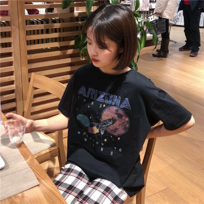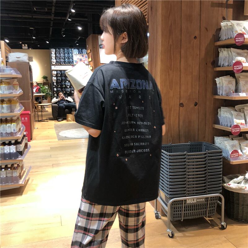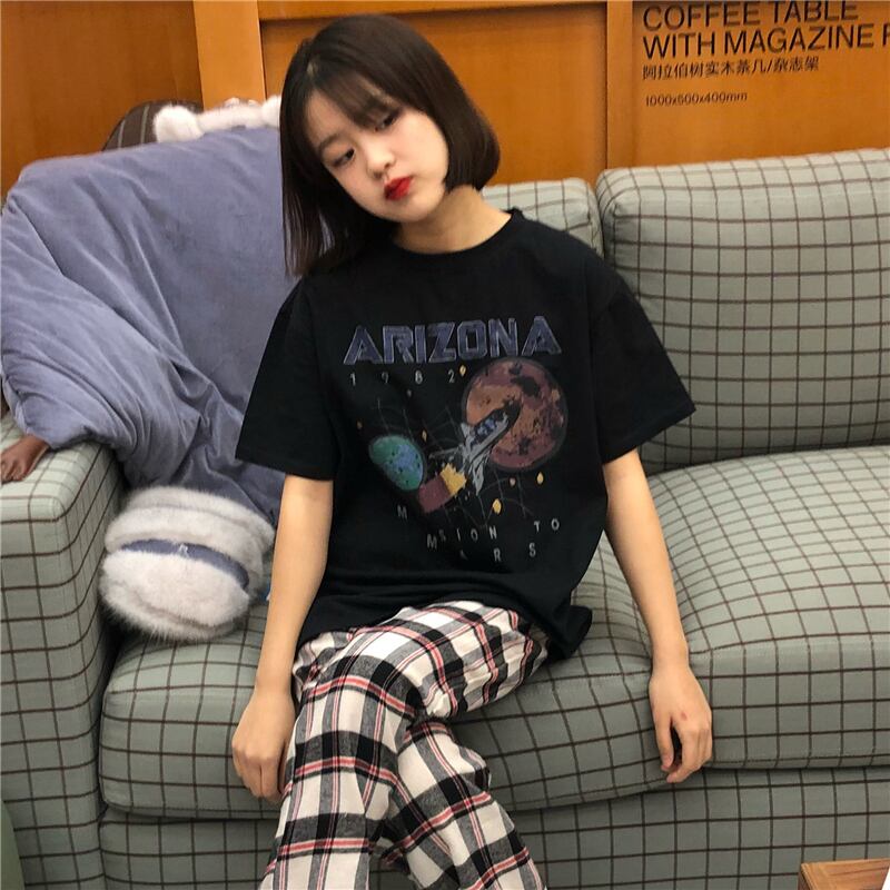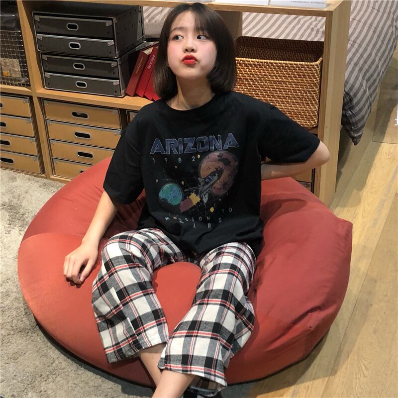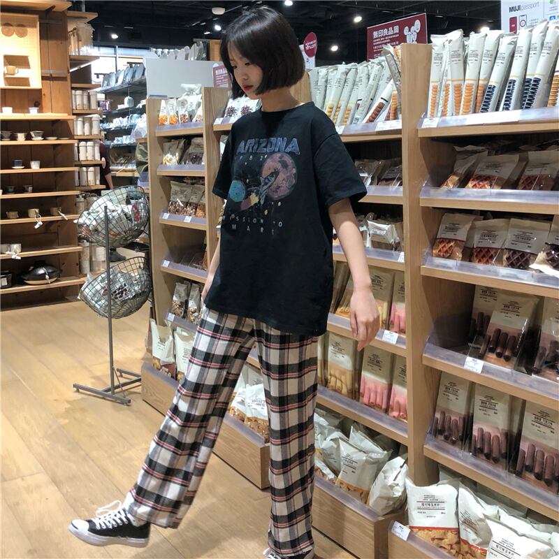 2020新しい夏の女性の緩い底入れシャツ半袖Tシャツトップ+伸縮性ウエストストレートチェックパンツ misskkl24186263715