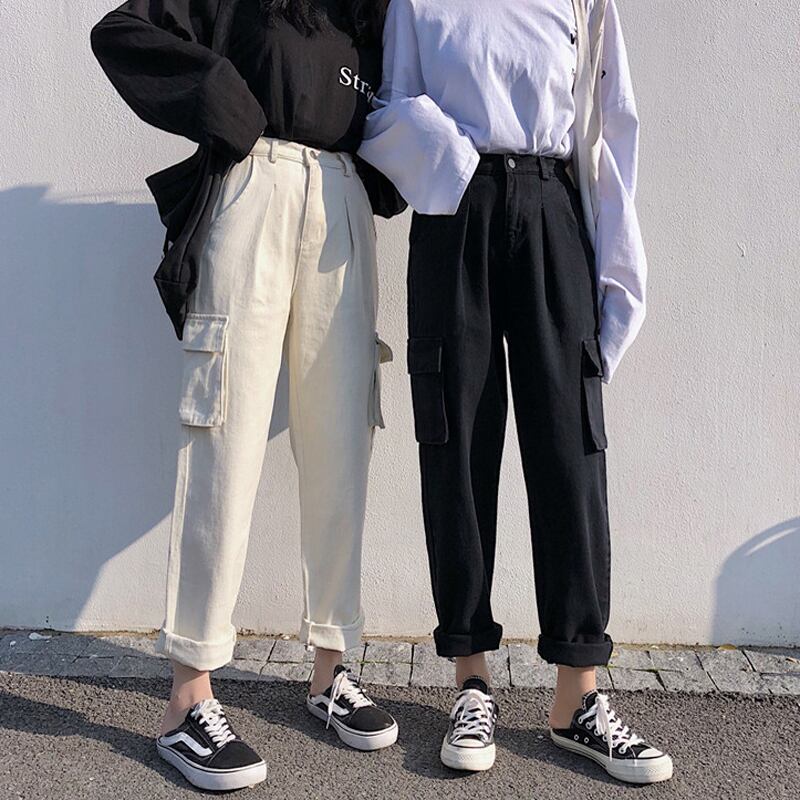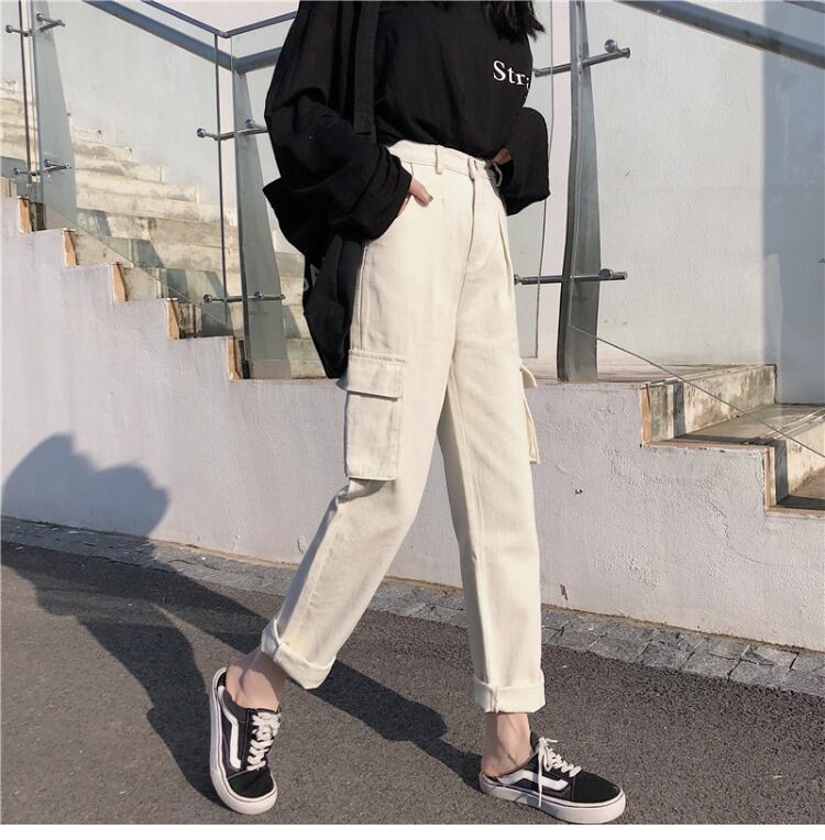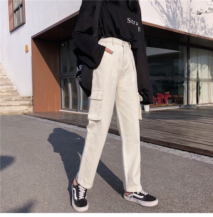春と秋の女性のスタイル緩い作業服ビッグポケットストレートパンツウエストワイドレッグパンツジーンズズボン学生パンツ misskkl91537151678