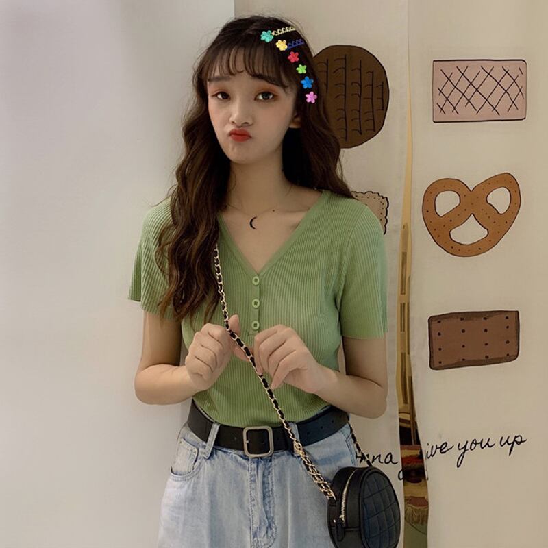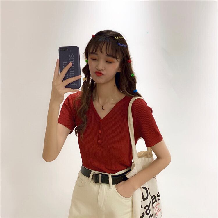2020年夏の新色の無地ニット半袖Tシャツ女子学生底入れシャツスリムスリミングVネックトップス misskkl79799356841