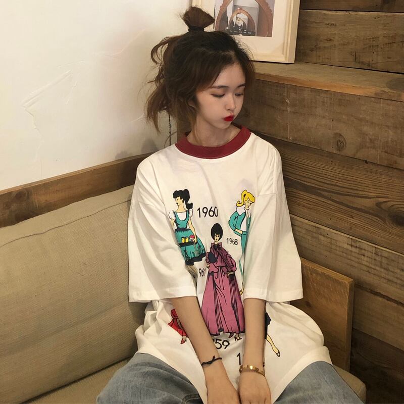 2019夏の新バージョンの赤い半ば長めの緩い漫画プリントかわいい学生丸首半袖Tシャツ女性 misskkl34575826704