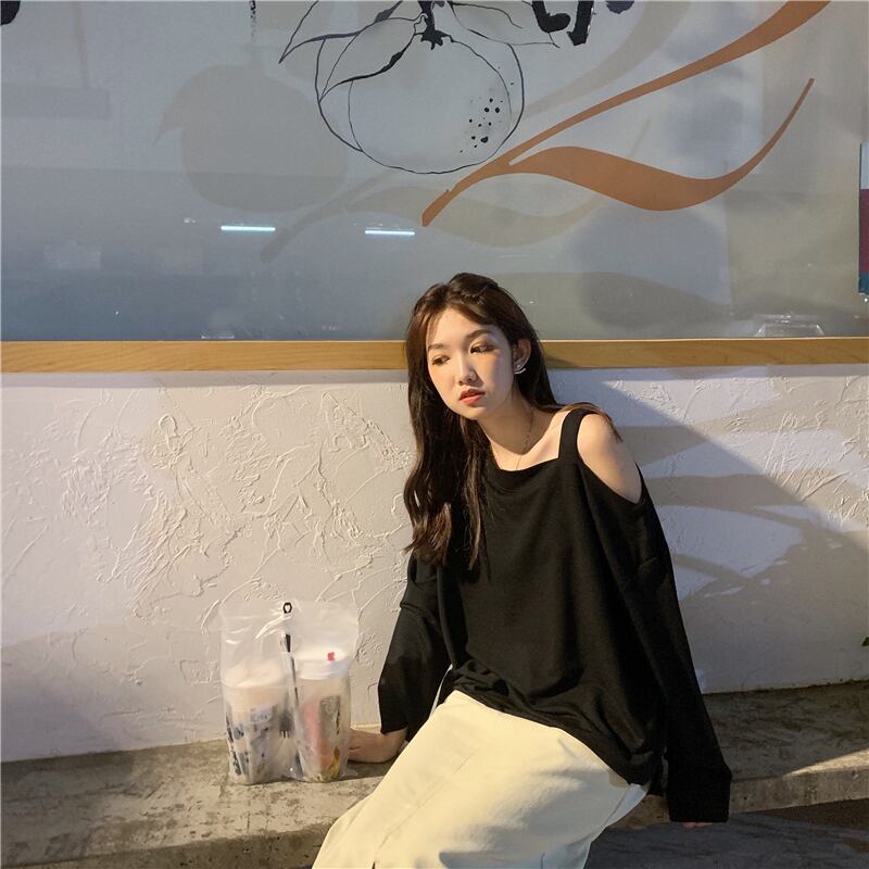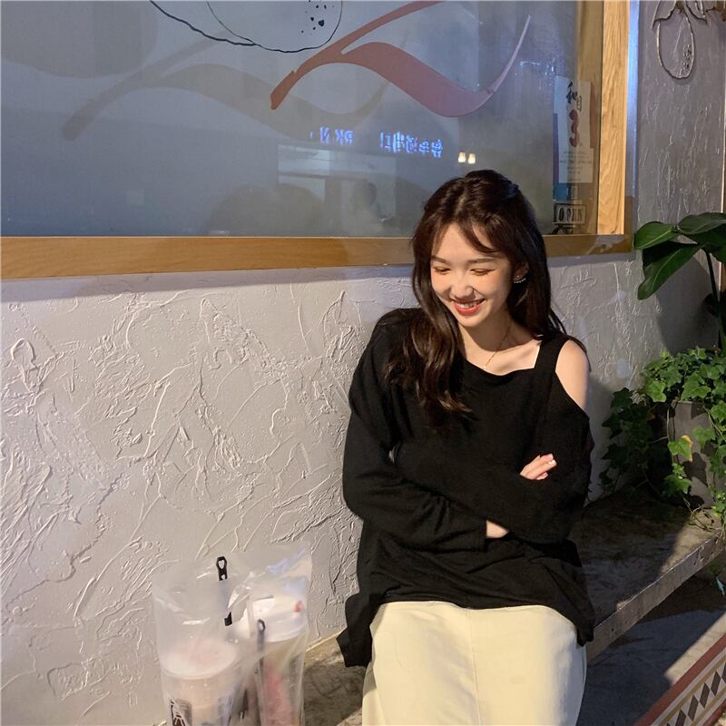 スプリングオータムレッドトップス ルーズTシャツ レディース ロング 春物 秋物 オフショルダー misskkl26246830530