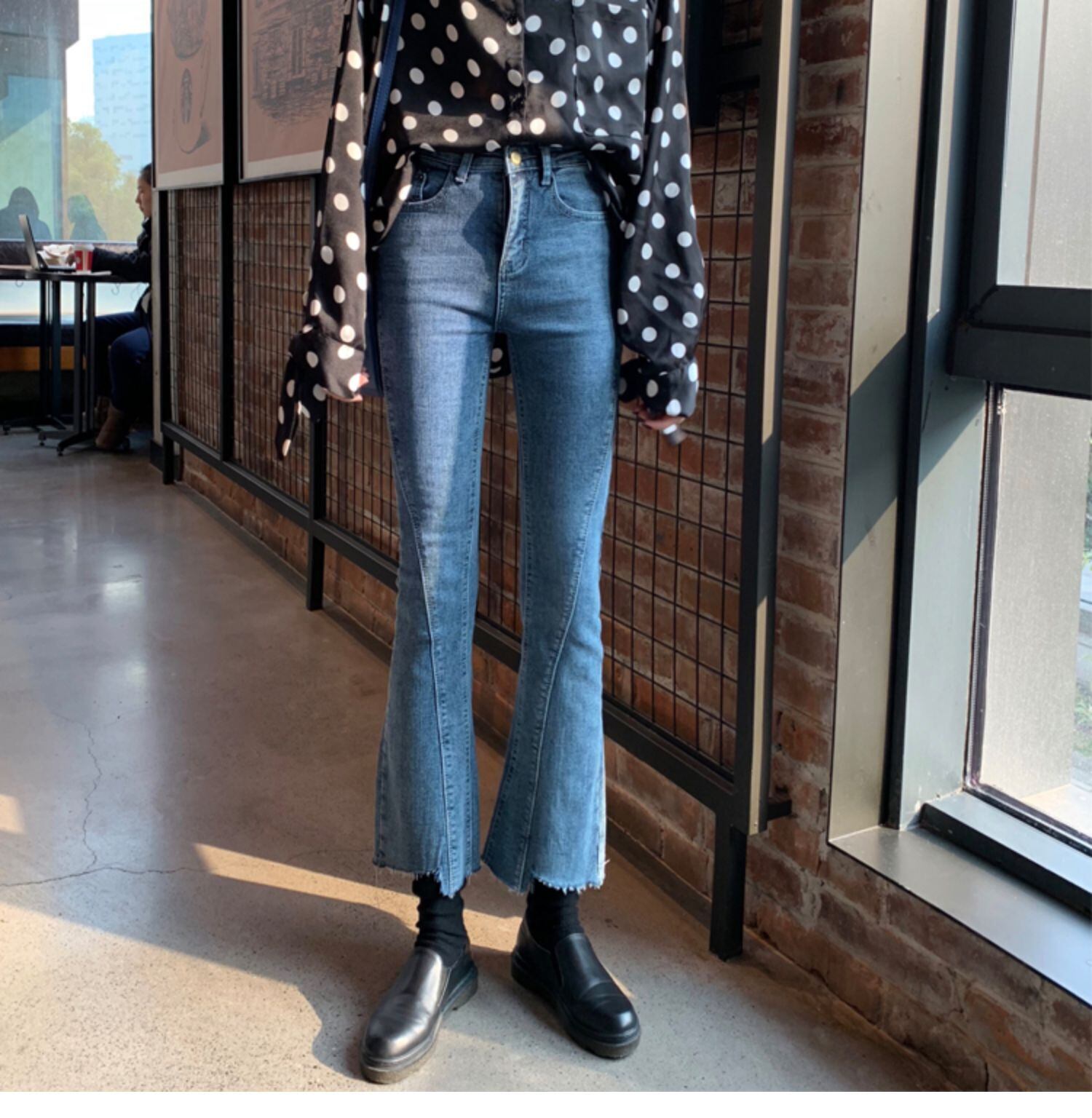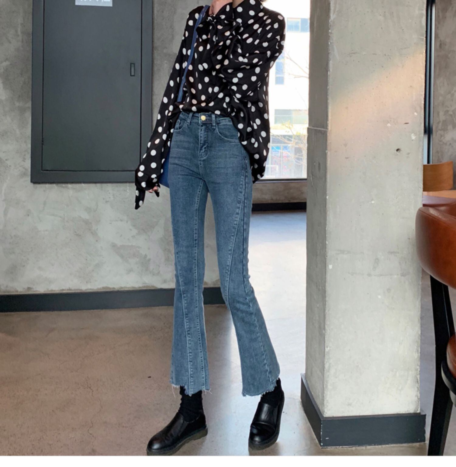 2020年春と秋の新しい不規則なマイクロフレアパンツ、ハイウエスト、スリム、オールマッチの9ポイントジーンズ、女性のネットレッドパパパンツ misskkl50476374735