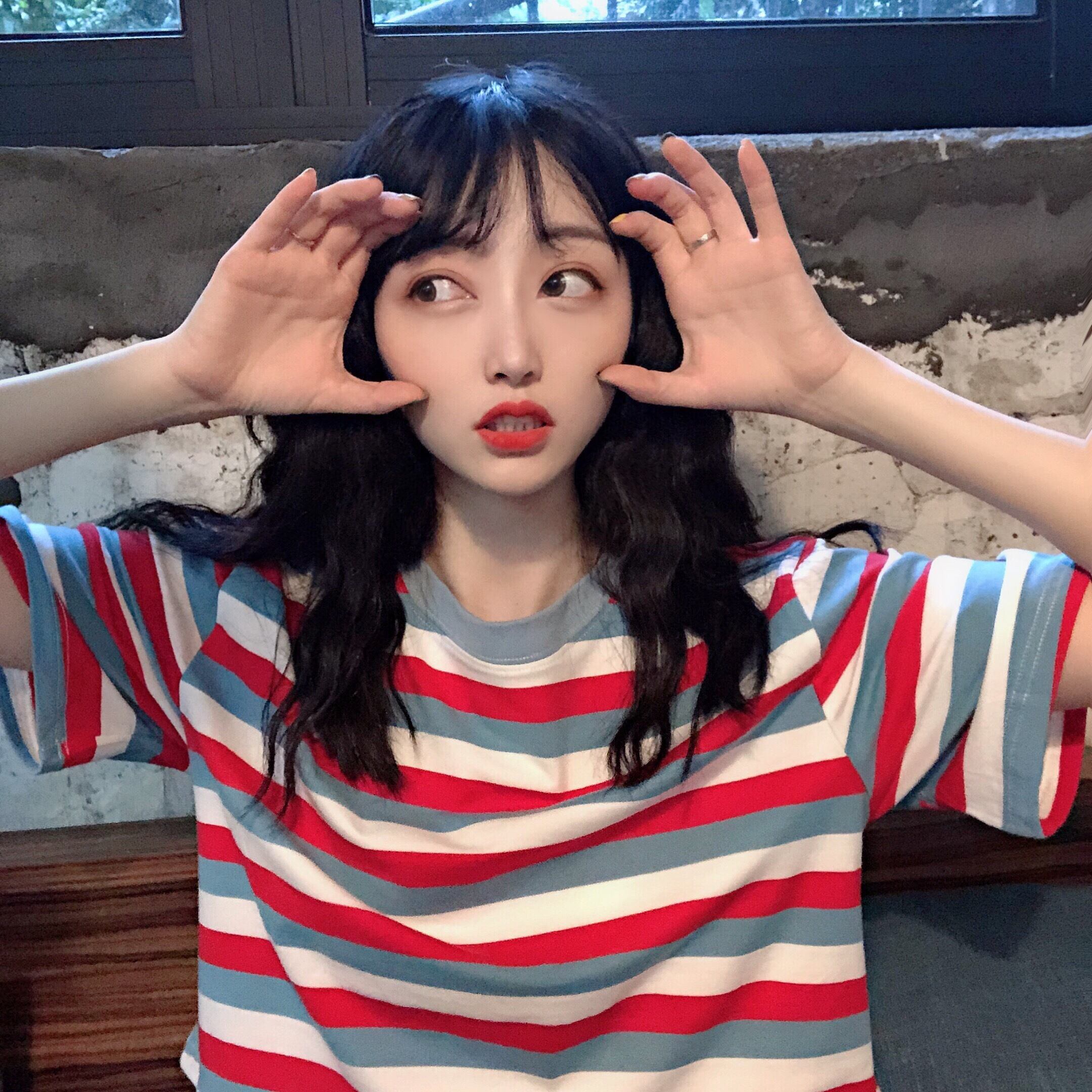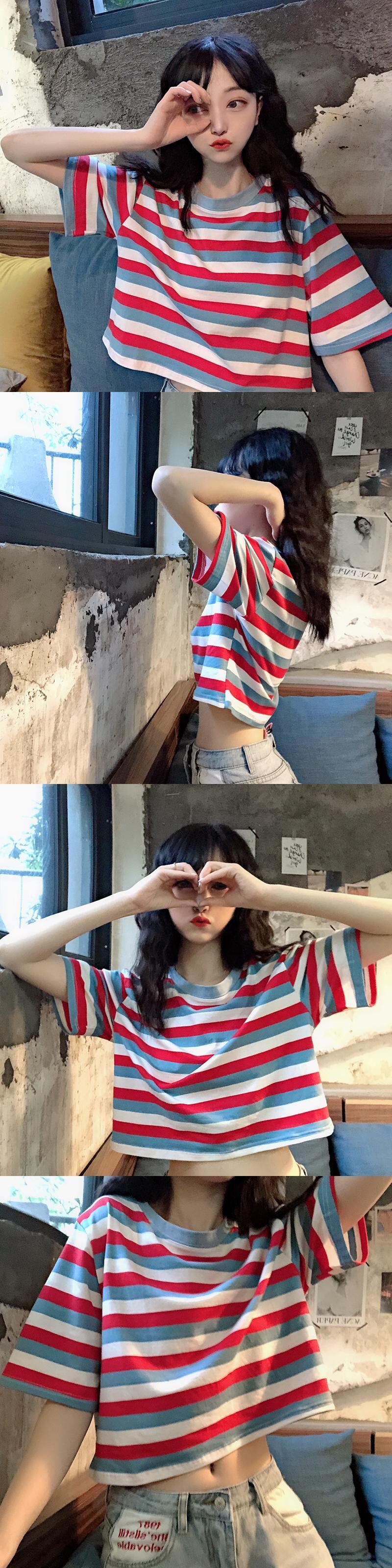 2020年夏新作ルーズワイルドスモールフレッシュヒットカラーストライプショートラウンドネック半袖Tシャツ女子学生 misskkl66744423501