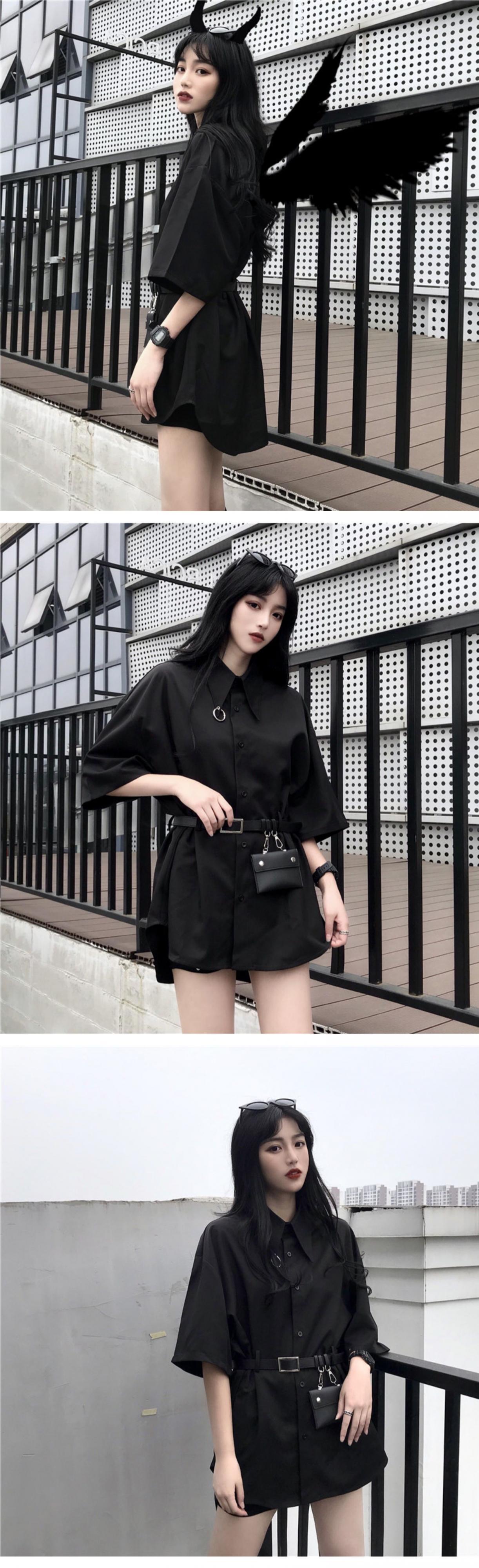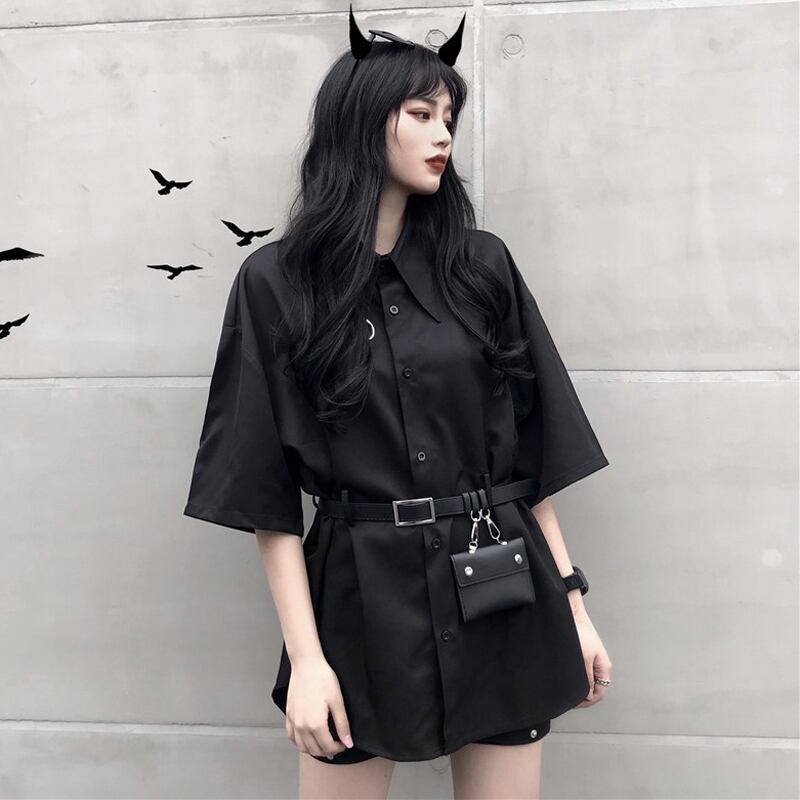夏バージョン2020新しい黒の緩い中間丈シングルブレストPOLO襟半袖学生個性シャツ女性 misskkl17009443830