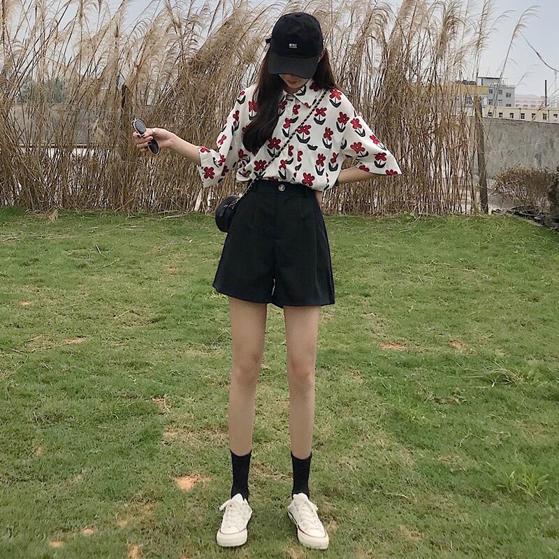 色:ブルゴーニュショーツ,黒のショートパンツ,白地に赤い花シャツ,スタイル半袖
