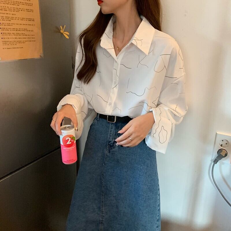 2020年春夏新作レトロ香港スタイルアブストラクトプリントシンプルでルーズなBFミドル丈ポロカラー長袖シャツレディース misskkl91865741585