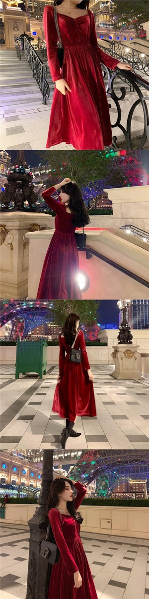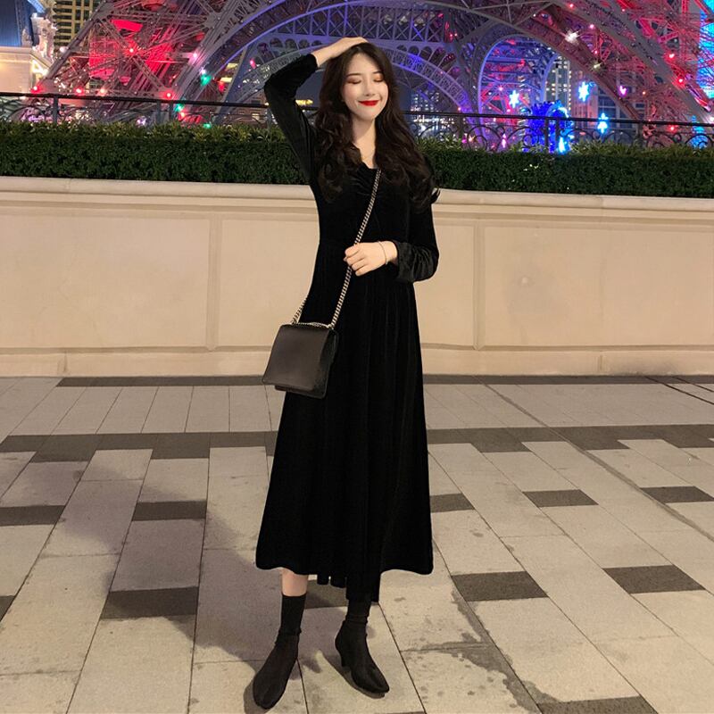 2020年春秋新作フレンチレトロ気質Vネック薄黒ドレスウエストミドル丈長袖ワンピースレディース misskkl79559293339