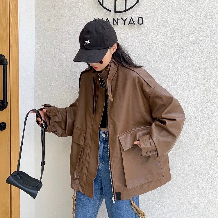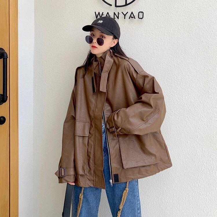 2020年春秋新作ルーズレトロ香港スタイルデザインセンス巾着ファッションオールマッチ長袖レザージャケット女子学生 misskkl84278402581