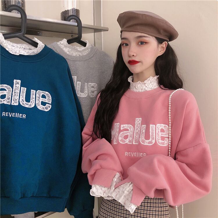 厚手のセーターとベルベットの婦人服2020新しい流行のルーズスタイルウエスタンファッションレースステッチフェイクツーピーストップ misskkl65722423975