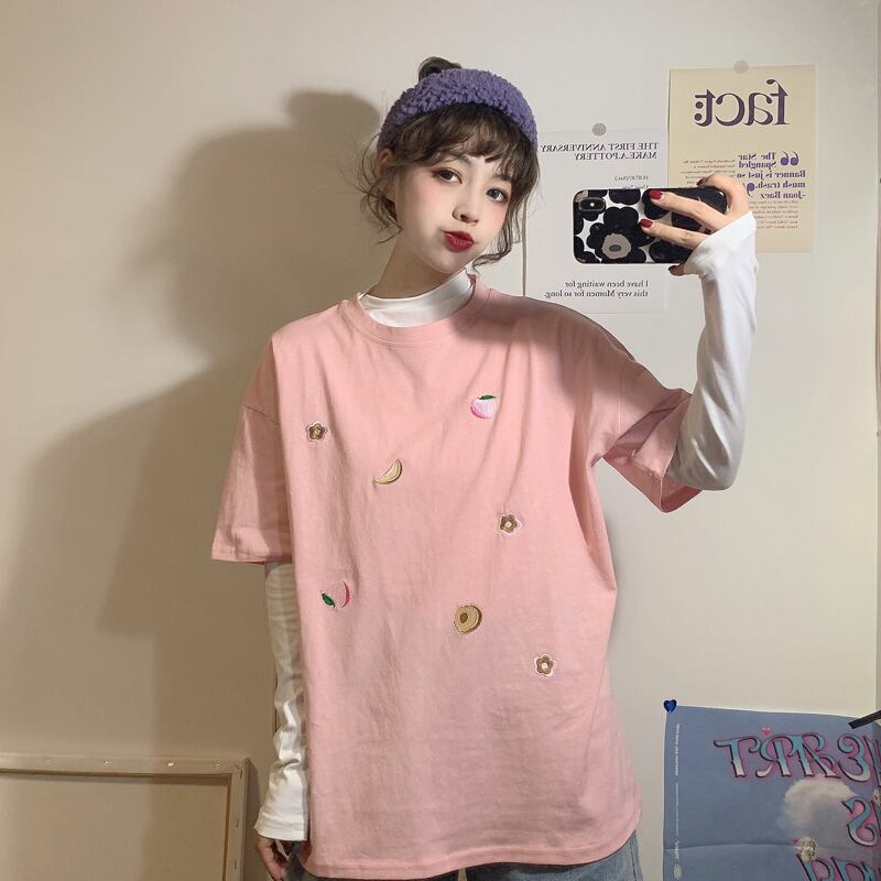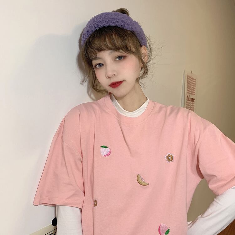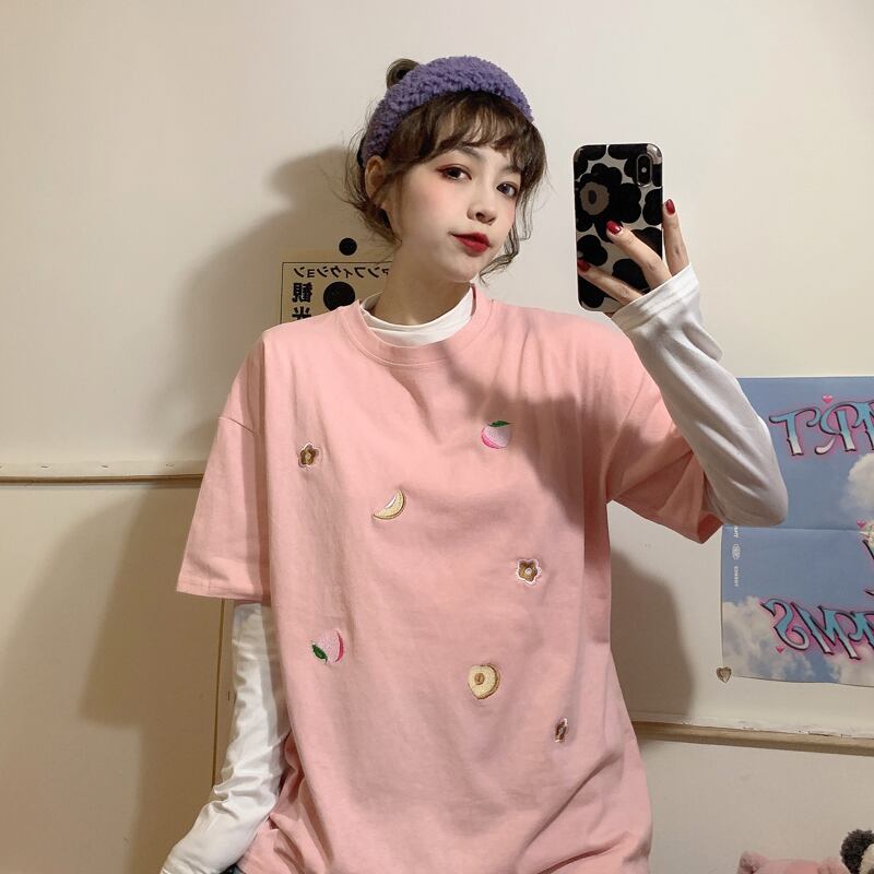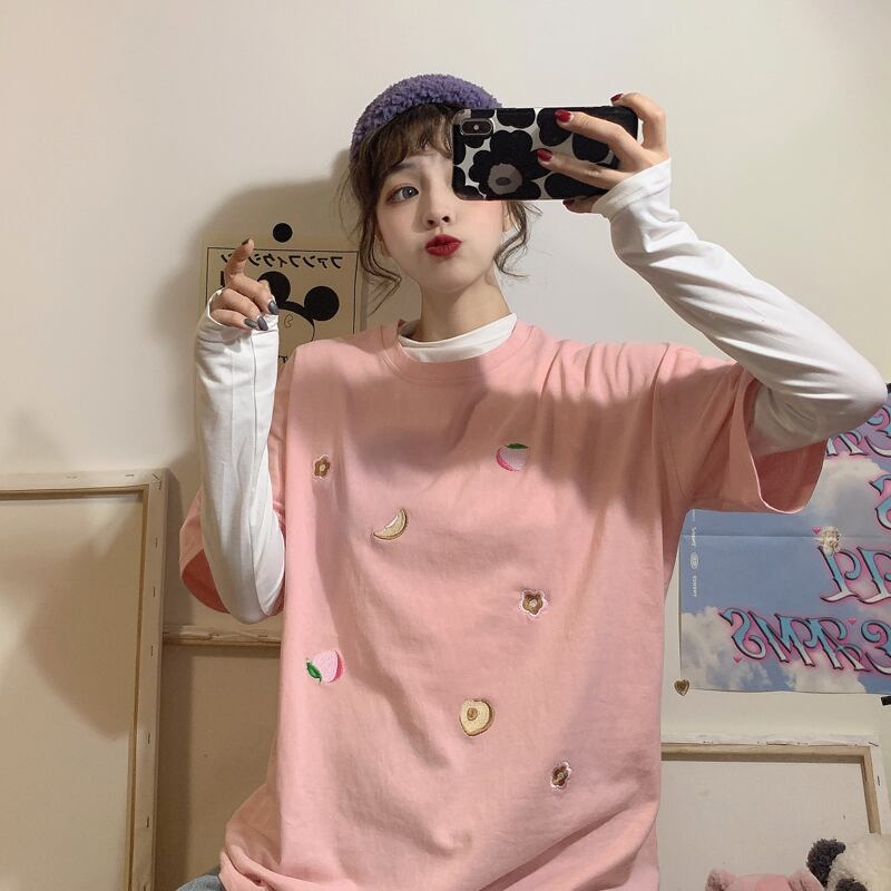 2020年春秋新しい小さな新鮮な果物の刺繡ルーズリトルマン怠惰なプルオーバー半袖Tシャツ女性ツーピース misskkl17223844424