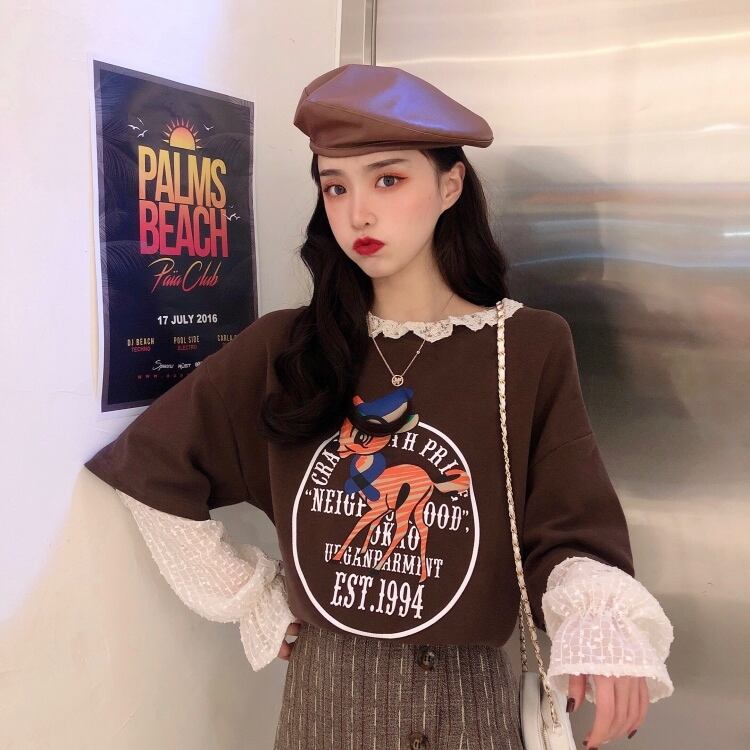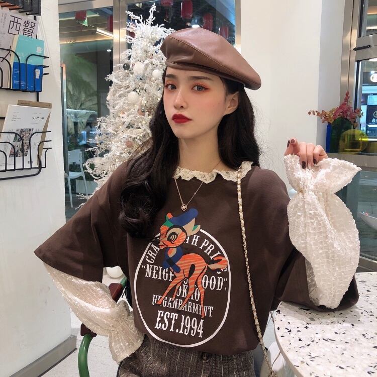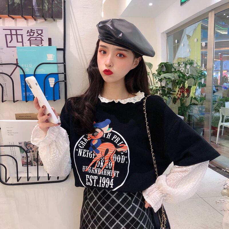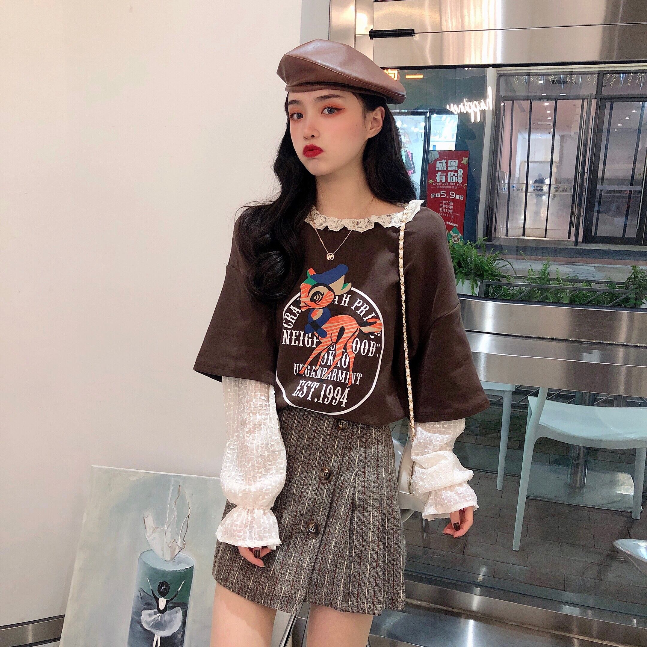 2020年春秋新作フレッシュフェイクツーピースレースステッチルーズミドル丈ウエスタンスタイル長袖ボトミングTシャツレディース misskkl19149961715