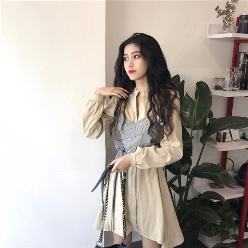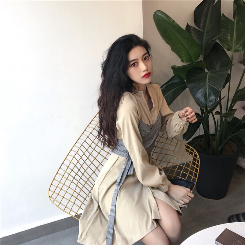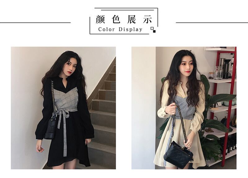 春と秋のバージョン2020新しいフランスのニッチなデザインセンス偽のツーピースチェック柄ウエストスリム長袖ドレス女性 misskkl51326380714