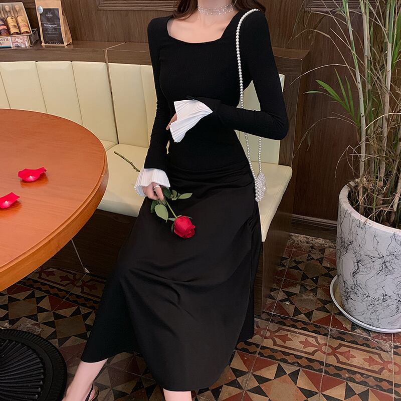 色:レーススリーブニットシングルピース,ベルト付きAラインスカート