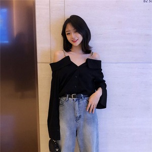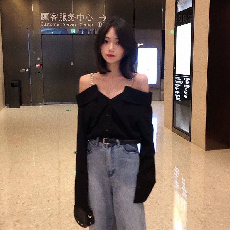 2020年春秋新作香港スタイル注意深いマシンストラップレスネックライン黒気質ルーズ長袖シャツ女性 misskkl44824215137