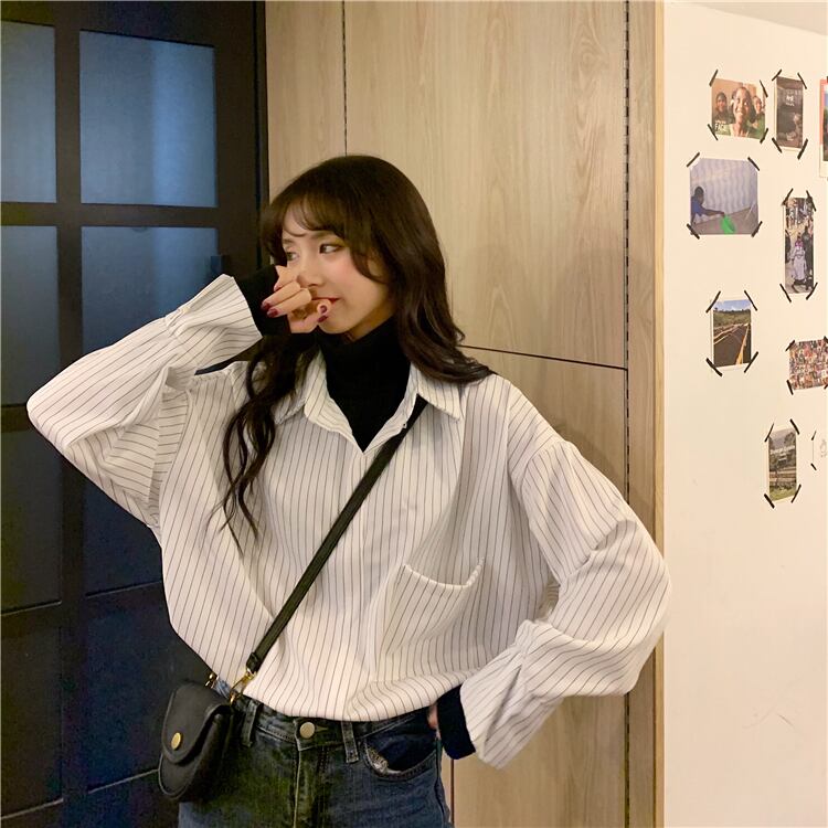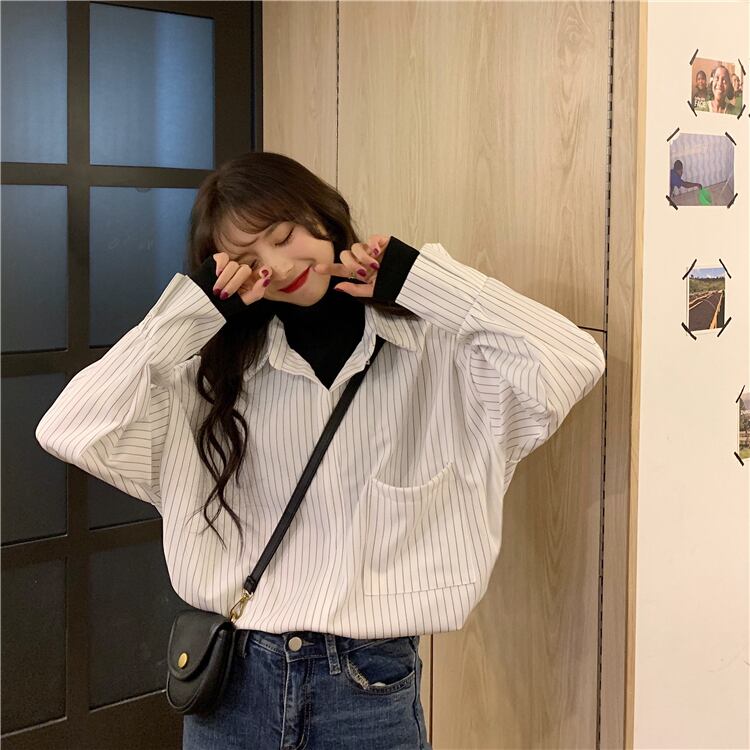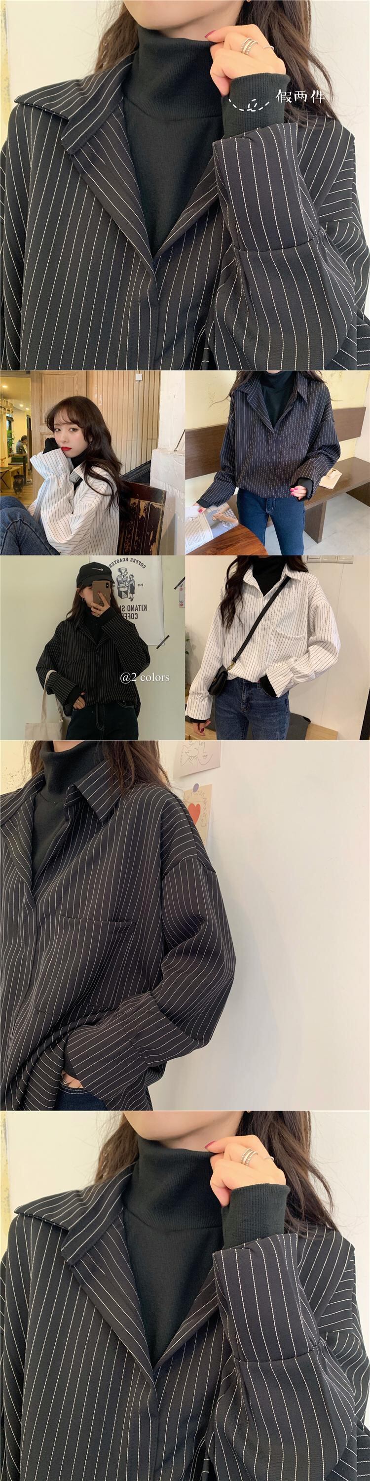 2020年春バージョンの新しい偽のツーピースハイネックストライプレトロ香港スタイルのブラウスルーズ長袖シャツ女性イン misskkl48583441177