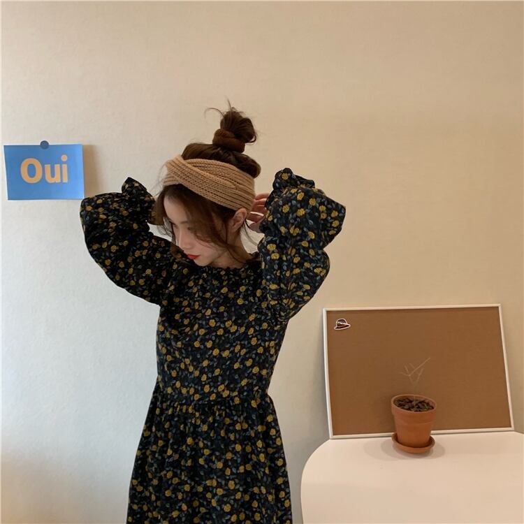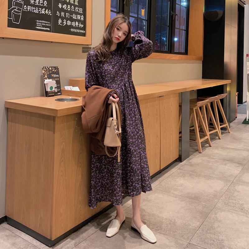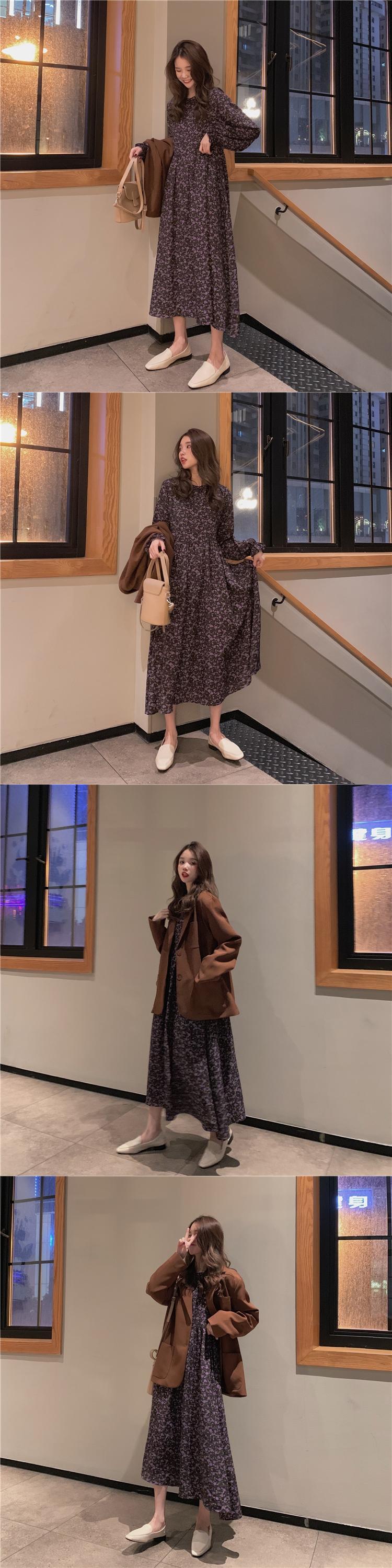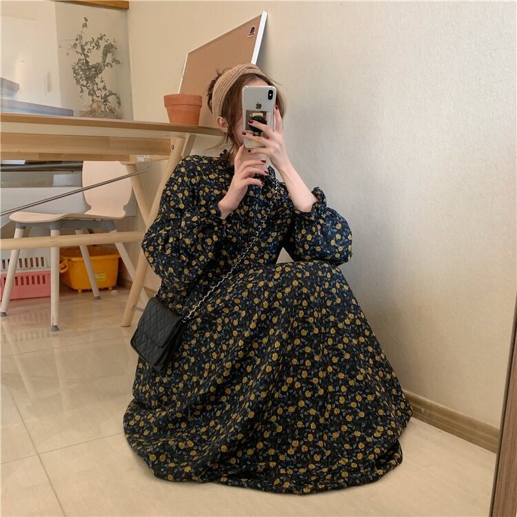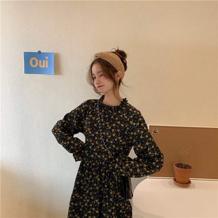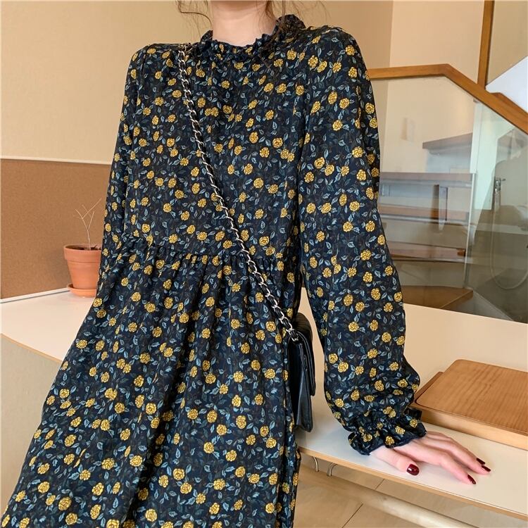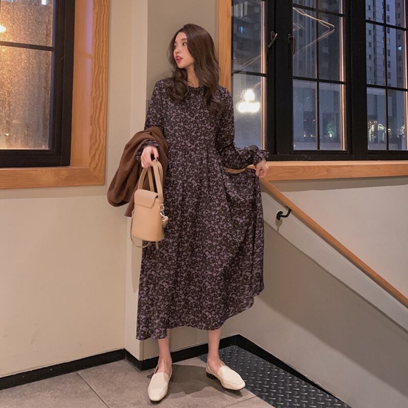 2020年春秋新作レトロフレンチニッチウエストウエストスリミングミドル丈フローラルプラティコドンスカート長袖ワンピースレディース misskkl5213675171