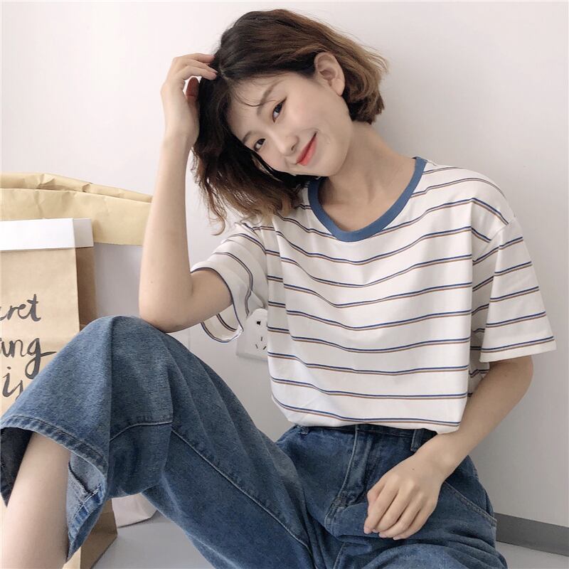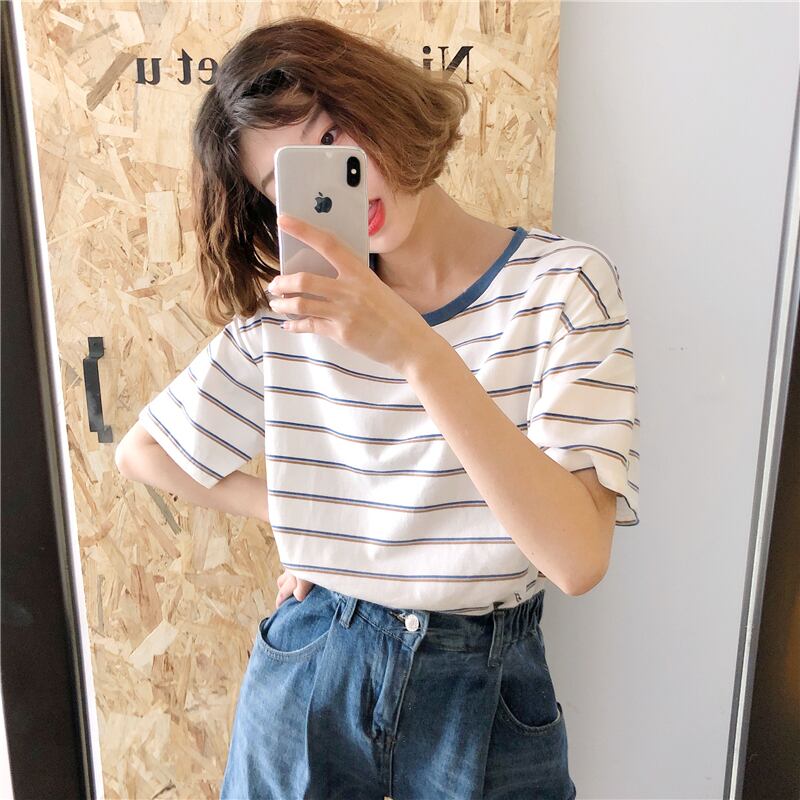 2020年春バージョンの新しいシックなルーズBF風カラーマッチングラウンドネックストライプ学生オールマッチ半袖Tシャツ女性 misskkl77058258290
