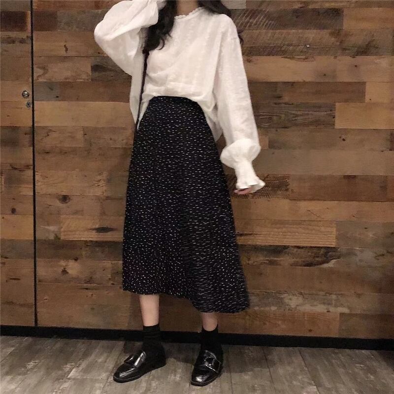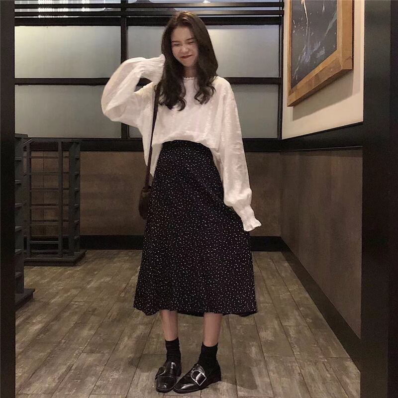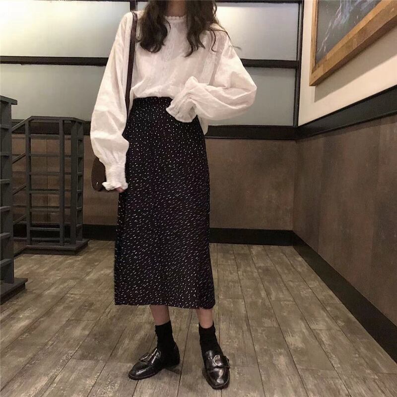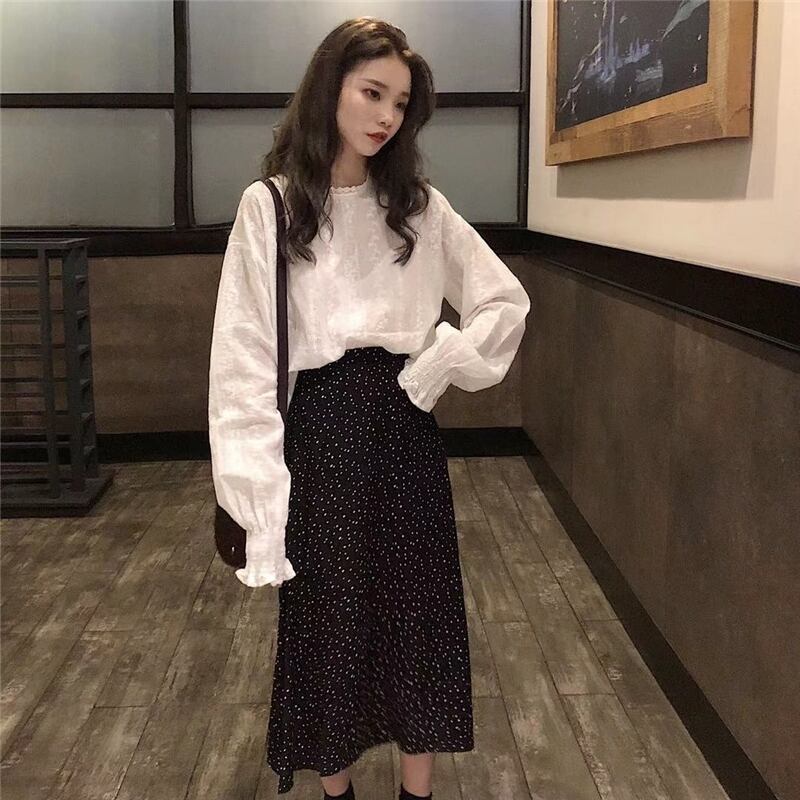 ファッションカジュアルスーツ春のレディースレースチェーンリンクホワイトシャツ+水玉スカートツーピースロングスカート misskkl7529009001