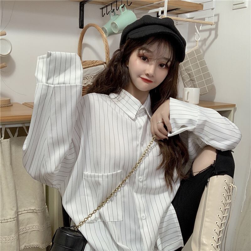 2020年春バージョン新作ルーズBF風縦縞ミドル丈ラージバージョンカップル長袖シャツ女子学生 misskkl42234652323