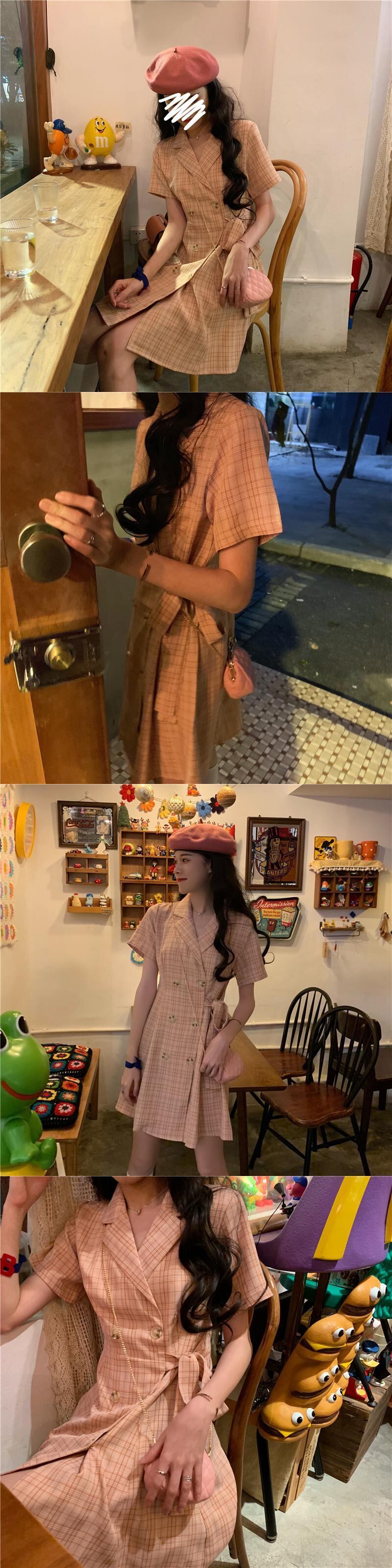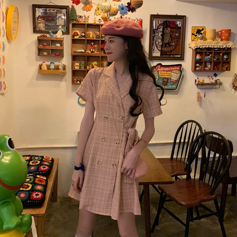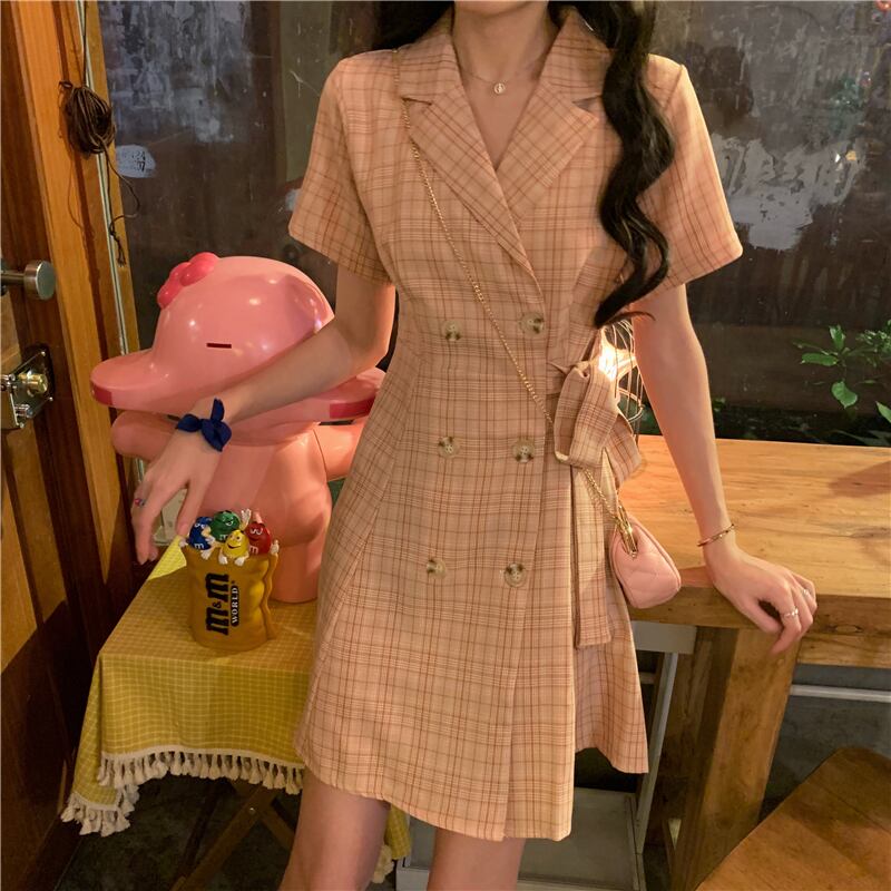 2020年春の新しい小さなフレッシュスーツの襟のウエストスリミングダブルブレストチェック柄半袖ドレス女性 misskkl81357172756