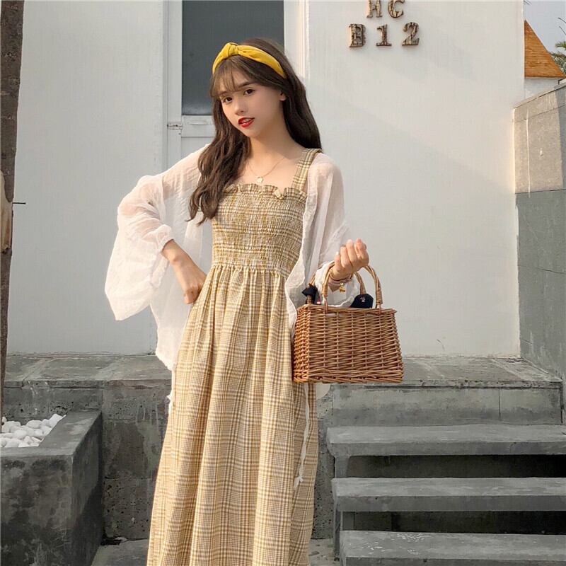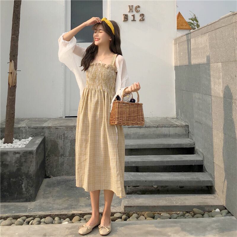 色:黒チェック柄ワンピース,ターメリックチェックスカートシングルピース,白い日焼け止め服