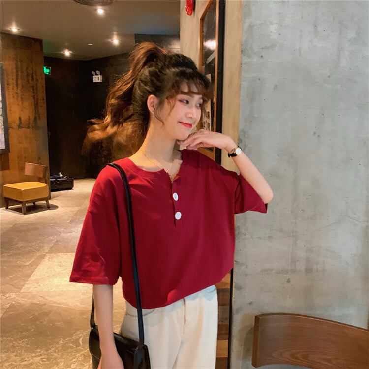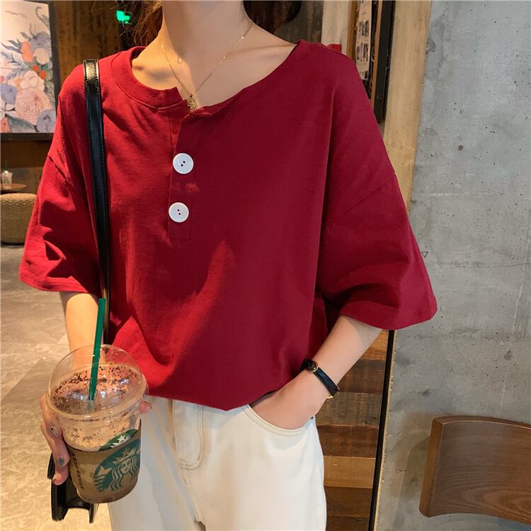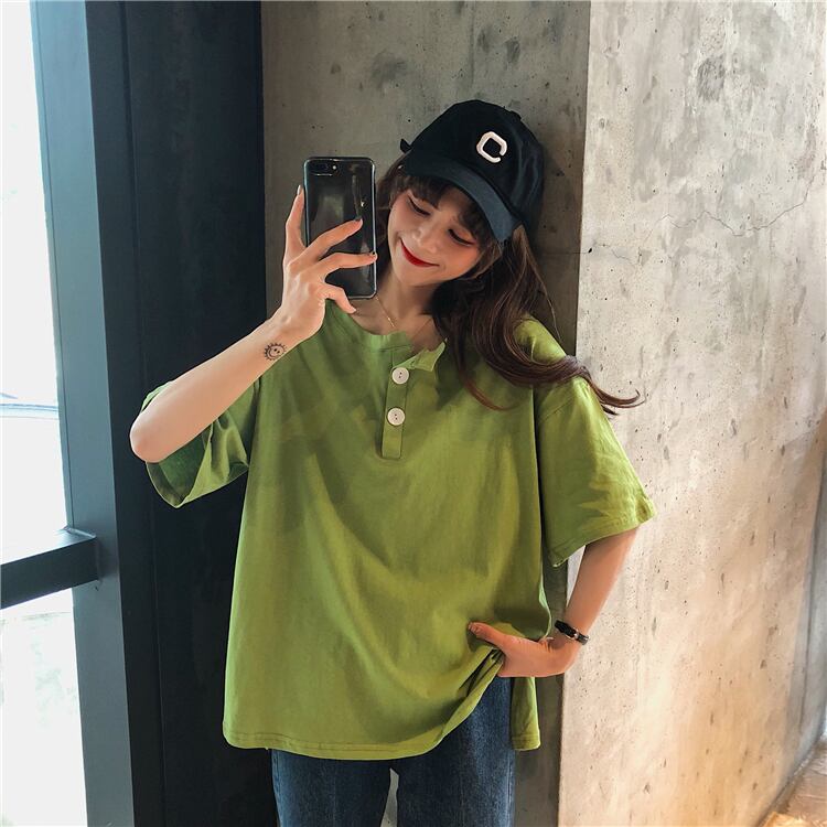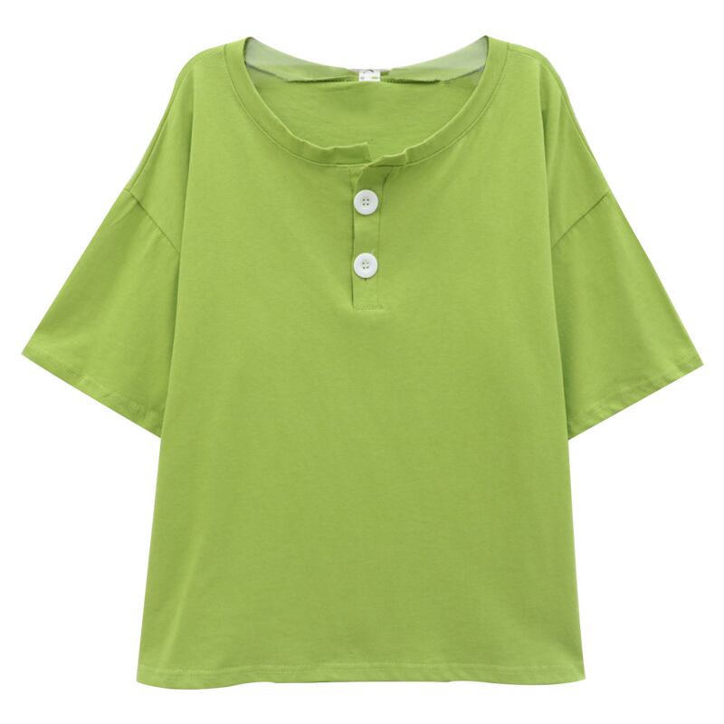 スプリンググリーンルーズラウンドネックボタンプルオーバー Tシャツ レディース 春物 Oネック misskkl93997193999