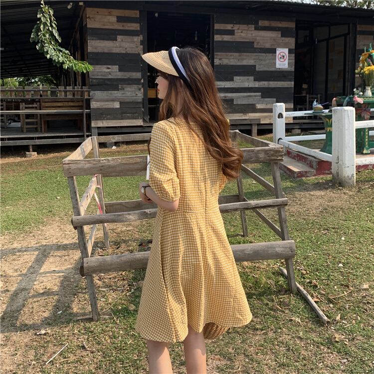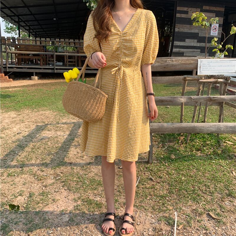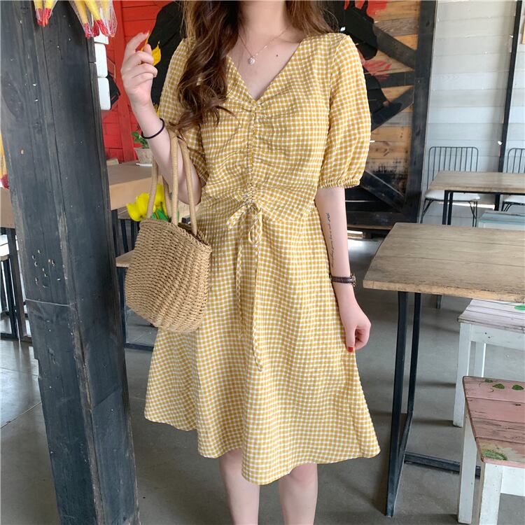 スプリングギャザーVネックウェスト格子柄ドレス レディース 春物 misskkl88354517053