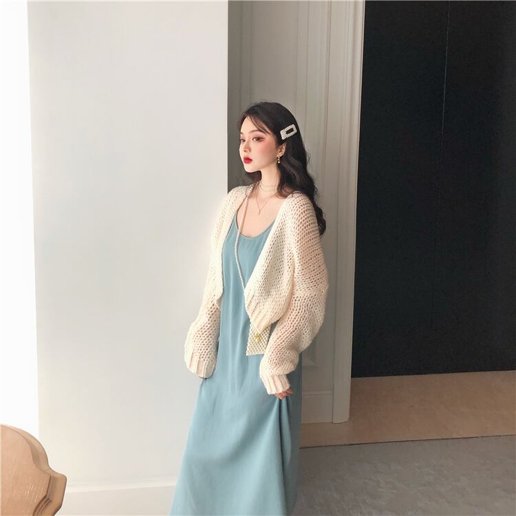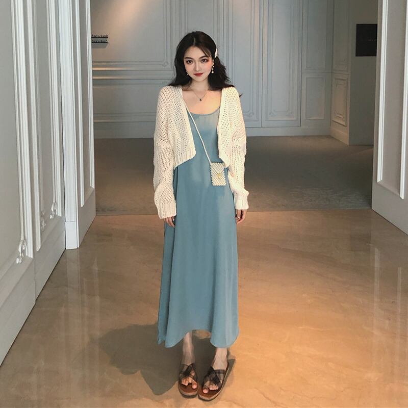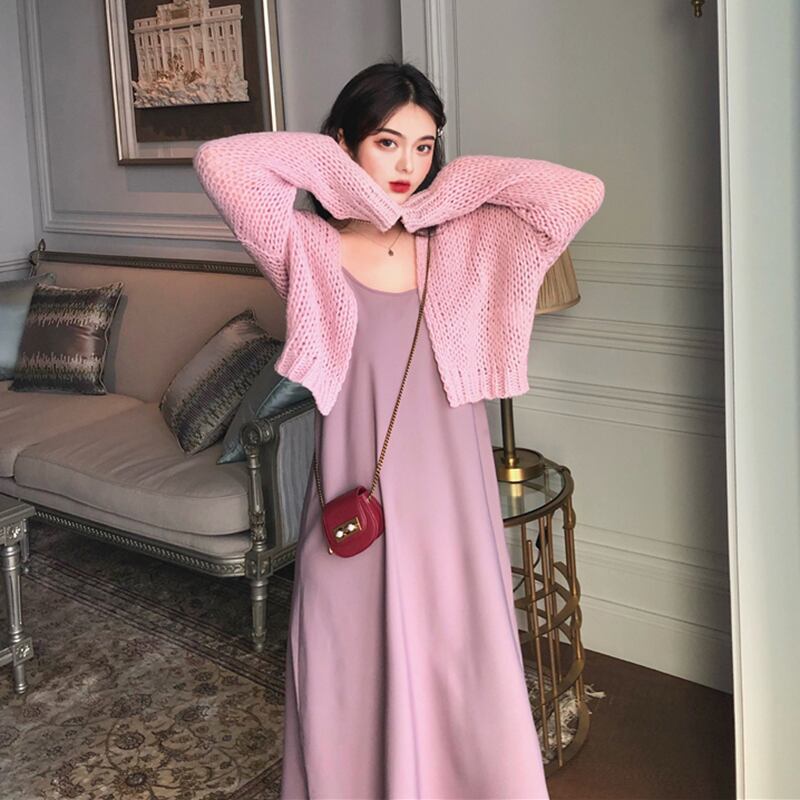 色:青いサスペンダードレスワンピース,紫のサスペンダースカートワンピース,ワンピースアプリコットカーディガン,パープルカーディガンワンピース