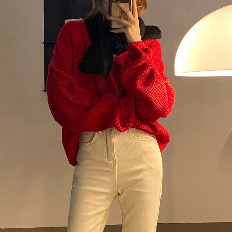スプリングスタイルルーズVネックソリッド カラーニットセーター トップス レディース ロング 春物 ソリッドカラー misskkl25943674088