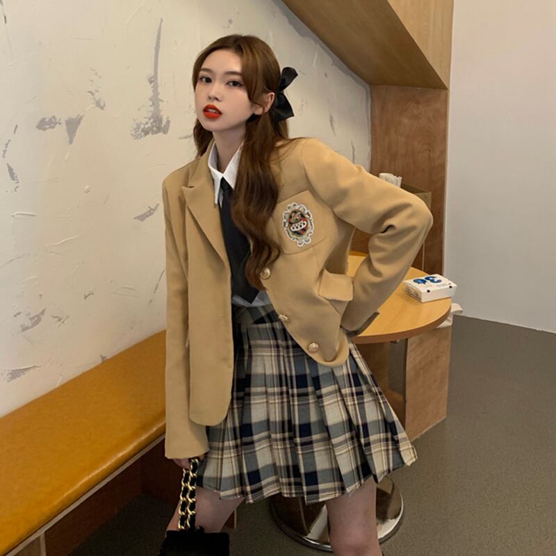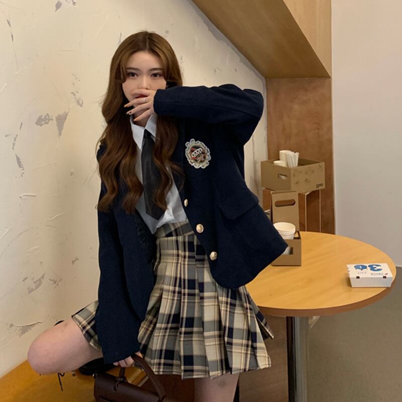 色:ダークブルーコート,カーキ色のコート,シングルプリーツスカート,シャツと蝶ネクタイ