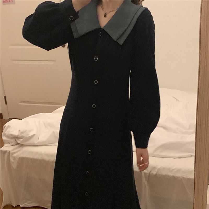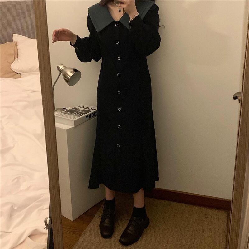 スプリングオータムスタンダードカラーウェスト薄手ロングドレス レトロ 春物 秋物 misskkl39529275748