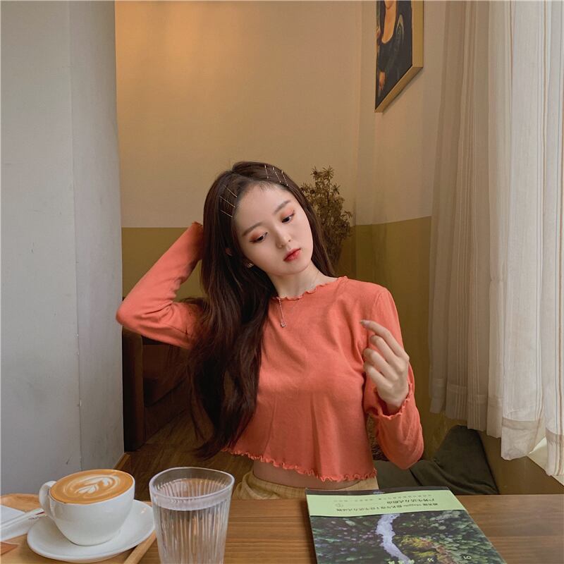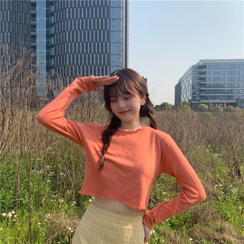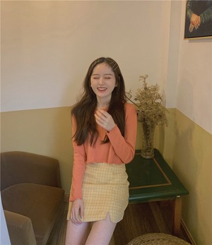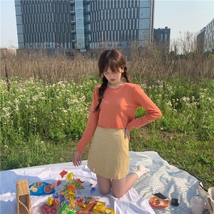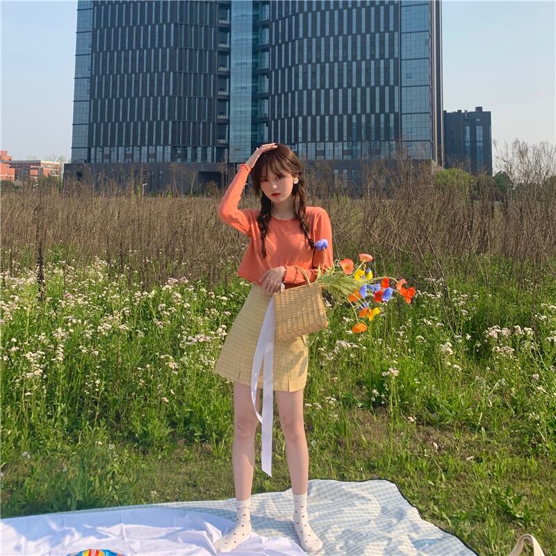 オレンジニットクロップドトップス ハイウェストスタンダード格子柄スカート ホワイト レトロ misskkl80540740203