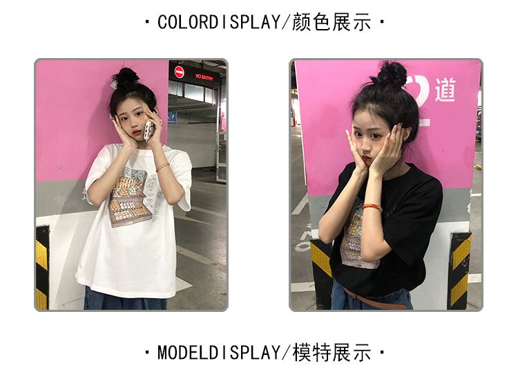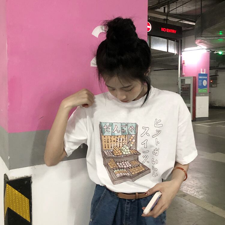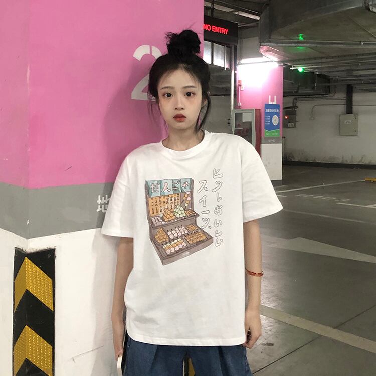 サマースタンダードプリントルーズホワイトTシャツ トップス レディース レトロ 夏物 misskkl73945714408