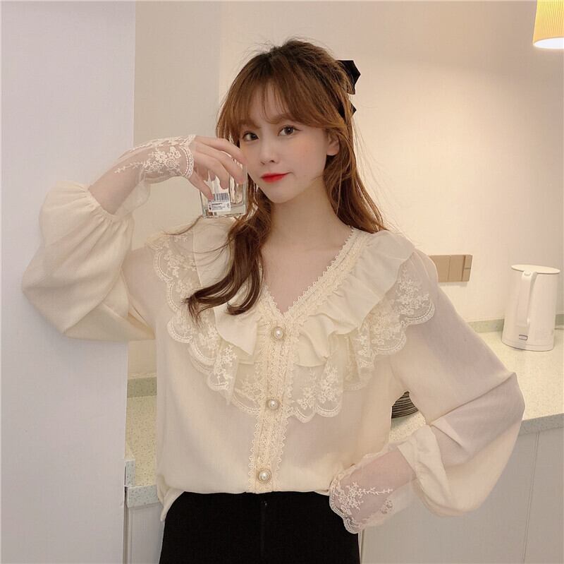 スプリングルーズVネックレースホワイトシャツ ロング 春物 ステッチ misskkl35025007001