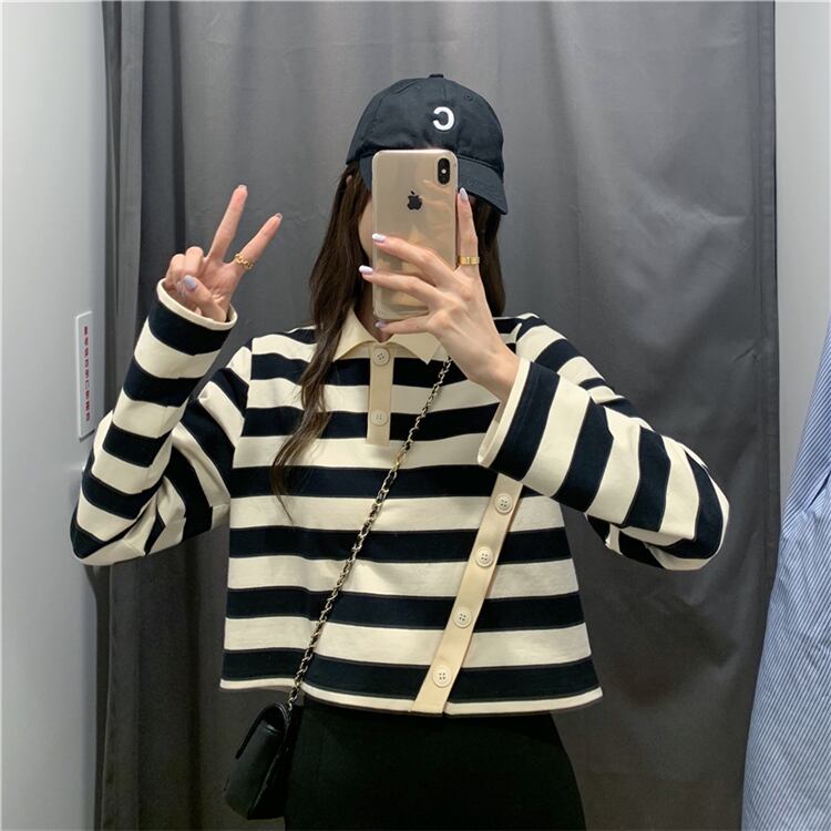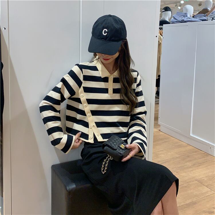 スプリングオータムスリムショートストライプカラーTシャツ トップス ロング 春物 秋物 misskkl1667757572