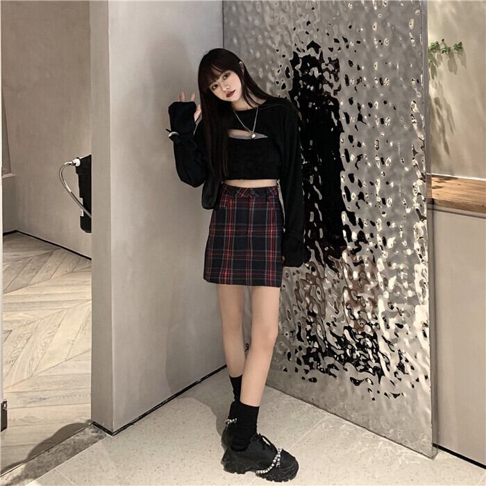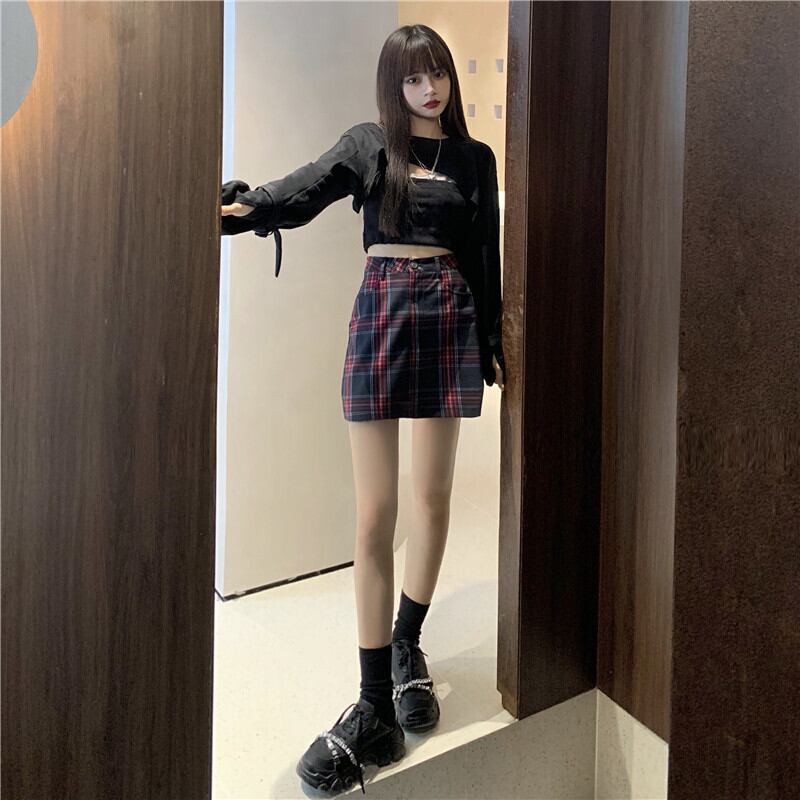 ブラウス ハイウェストスタンダード格子柄スカート ショート レトロ ステッチ misskkl46921804107