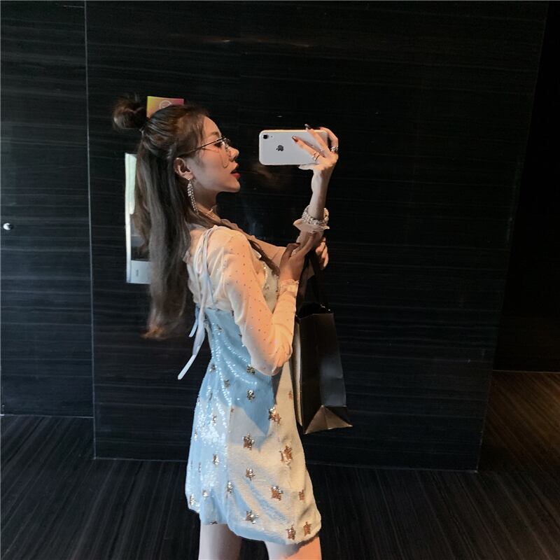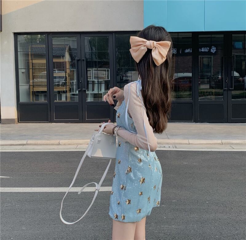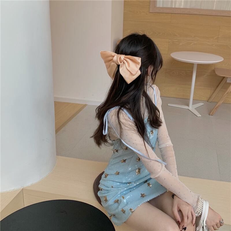 色:アプリコットボトムスシャツ,ライトブルーのスパンコールスカート