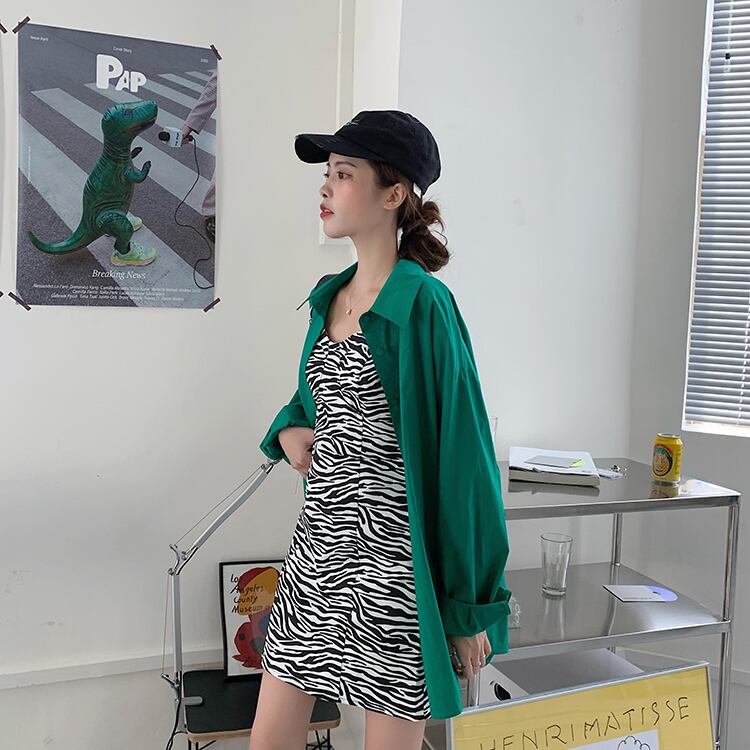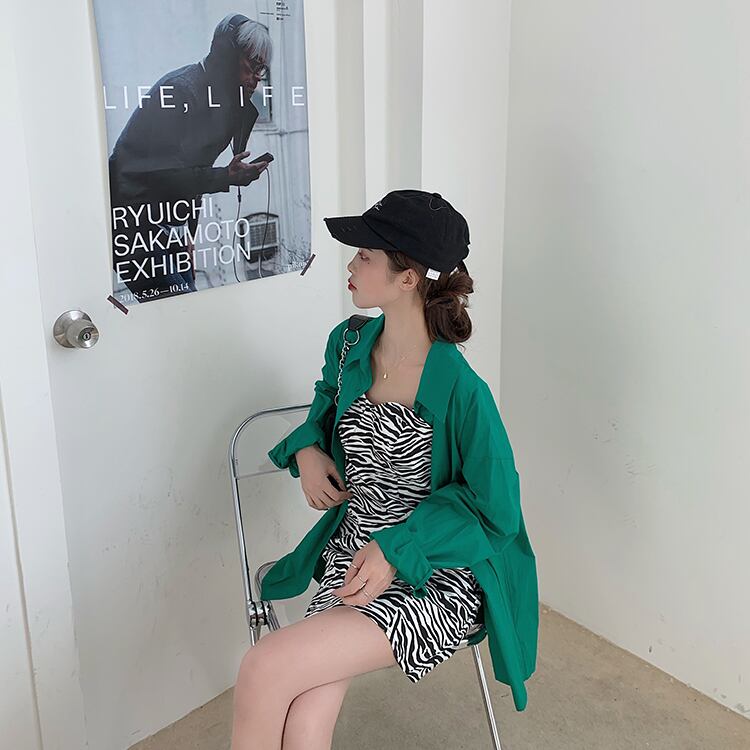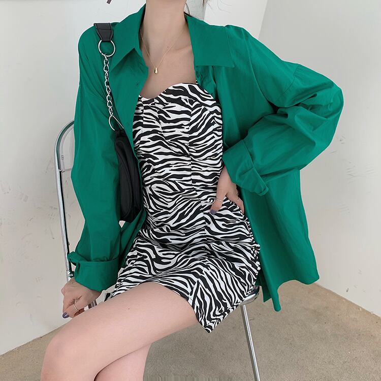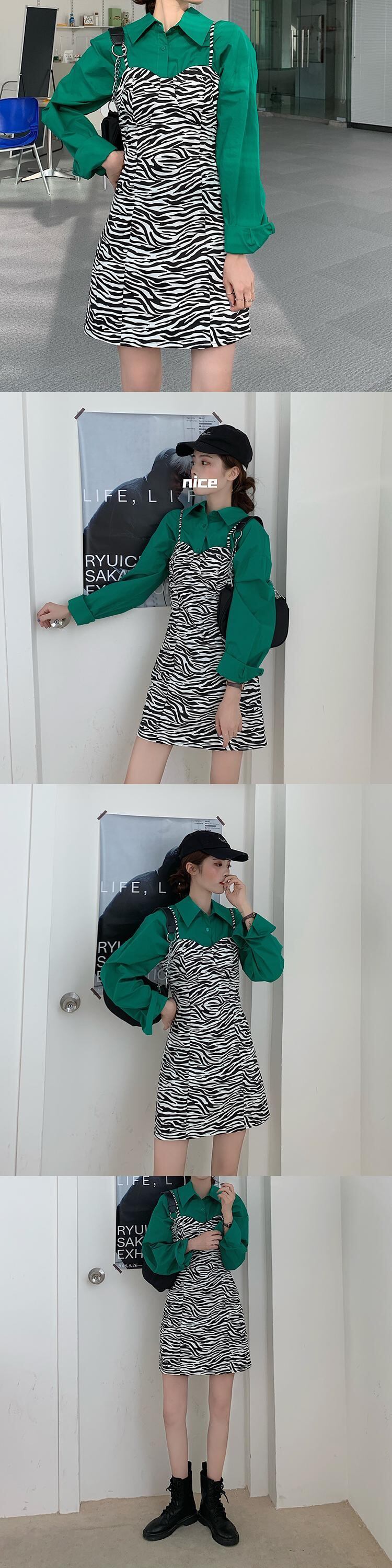 色:ゼブラ柄サスペンダースカート,緑のシャツ