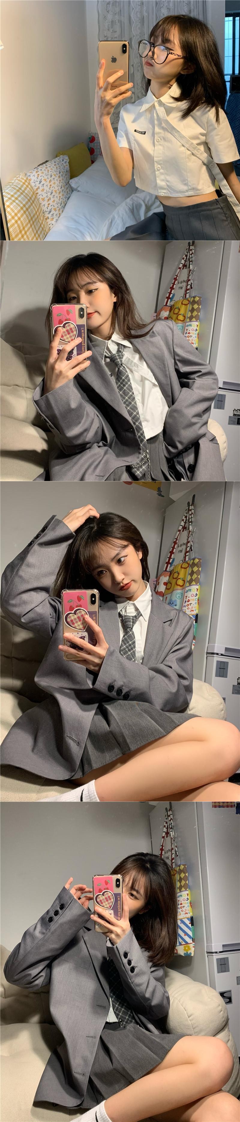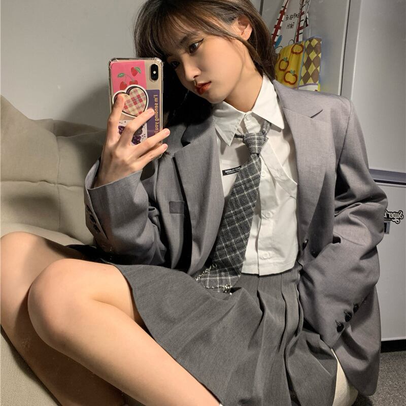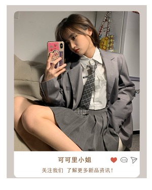 色:グレーのスーツ,半袖シャツ,チェーンネクタイ,長袖シャツ,プリーツスカート