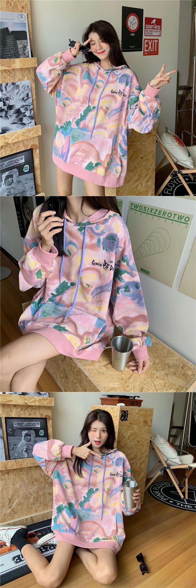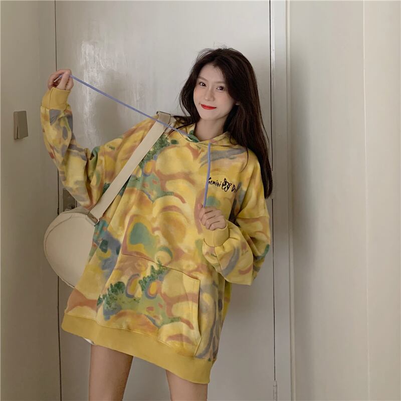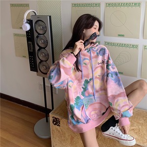 スプリングオータムフードルーズプリントセーター トップス ロング 春物 秋物 misskkl19462923261
