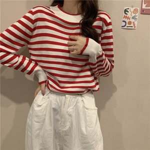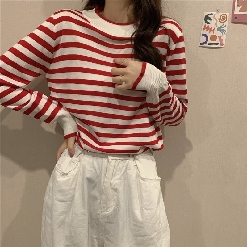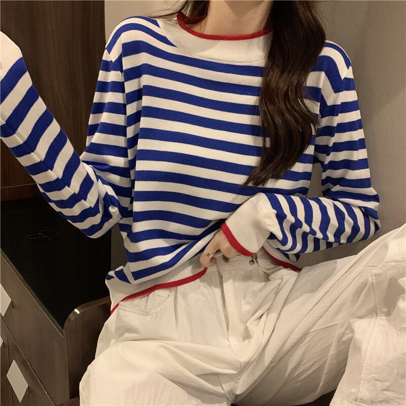 スプリングルーズラウンドネックプルオーバー カラーストライプTシャツ トップス ロング 春物 Oネック misskkl636548489