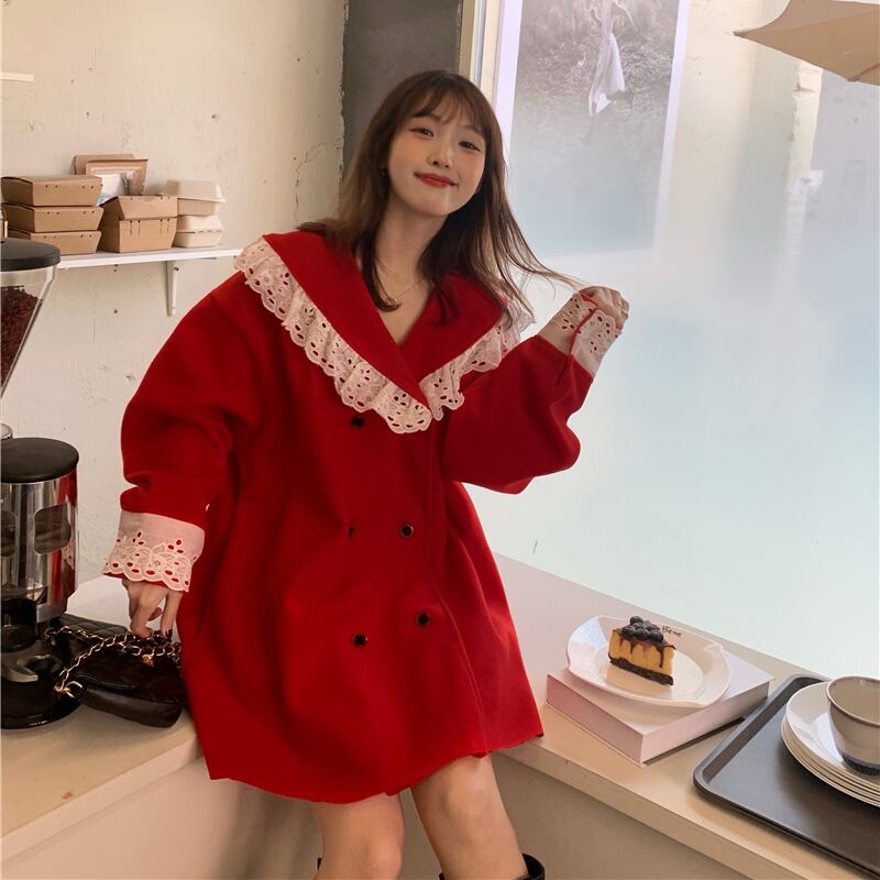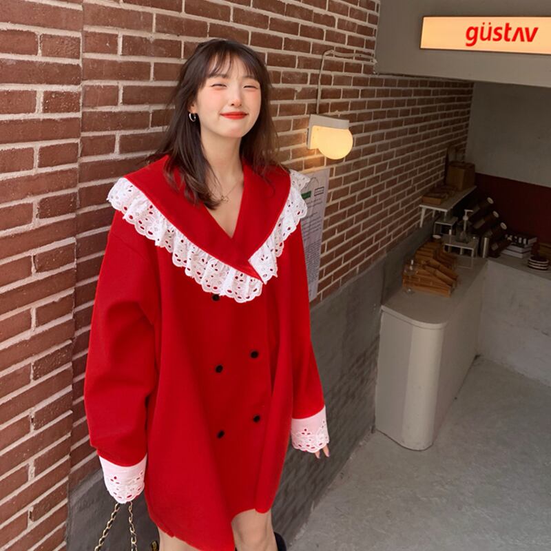 スプリングオータムスタンダードレースレッドルーズコート レディース ロング レトロ 春物 秋物 ステッチ misskkl98207137674