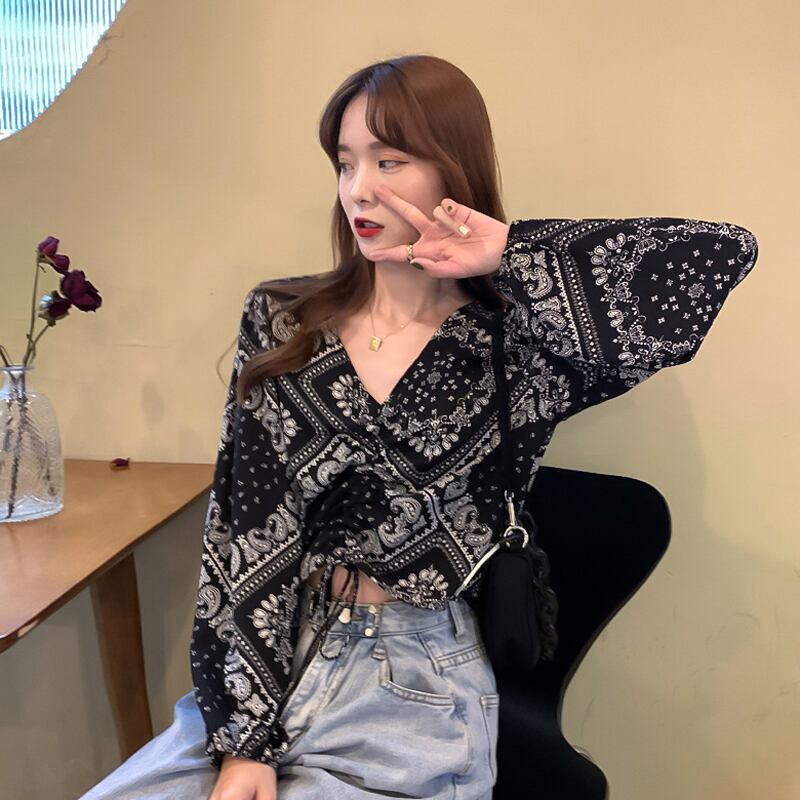 スプリングスタイルルーズショートVネックギャザーシャツ トップス ロング 春物 misskkl55688223103